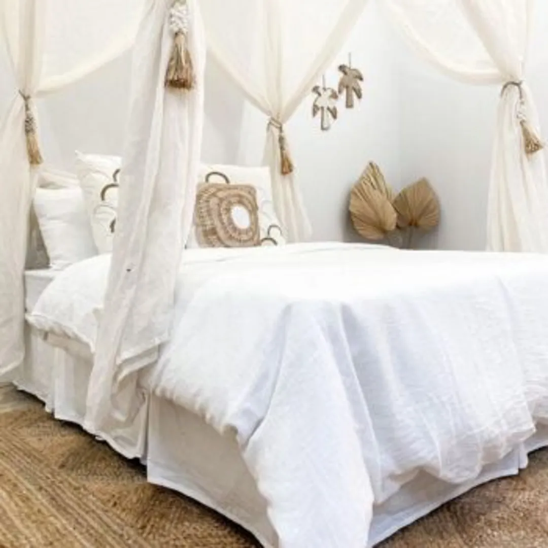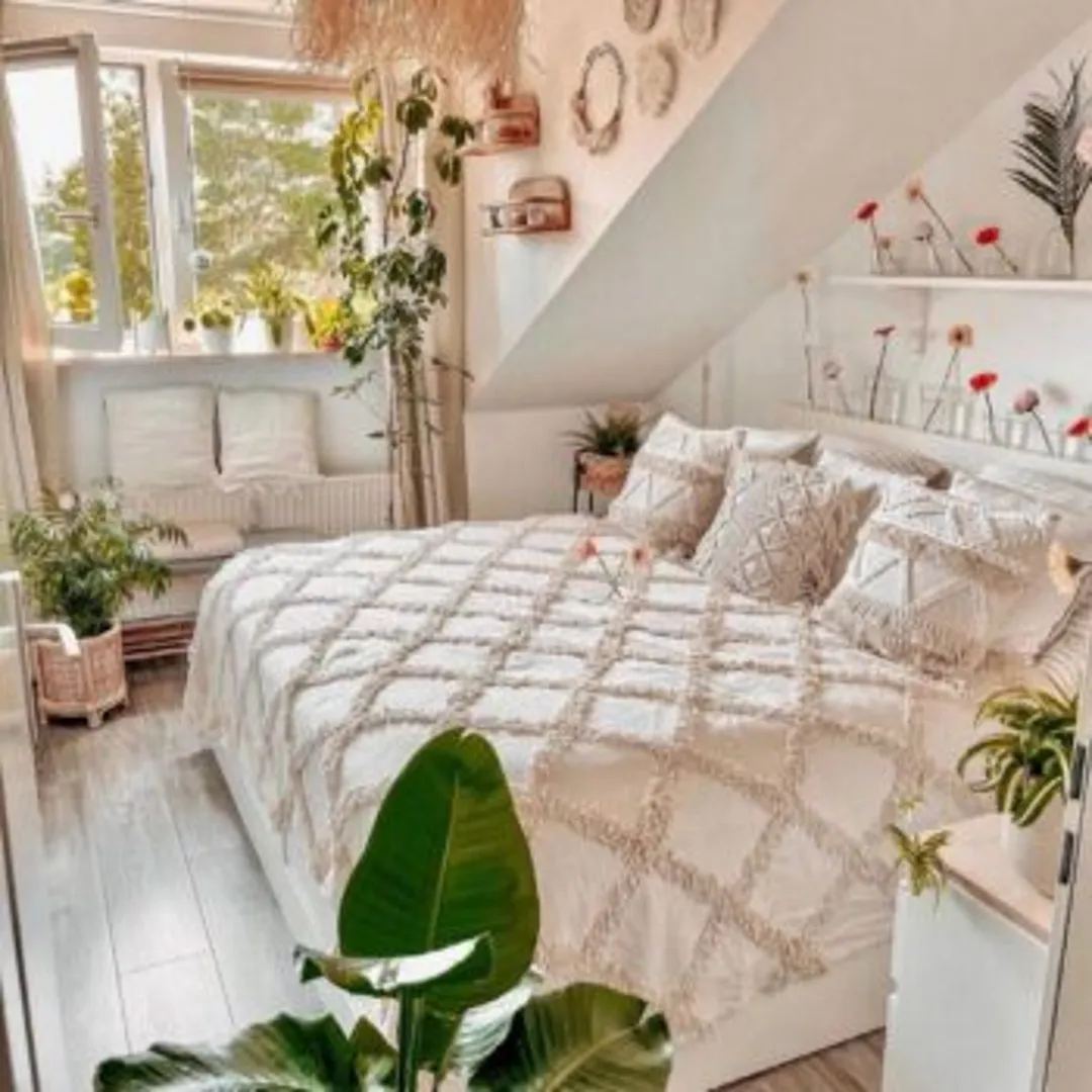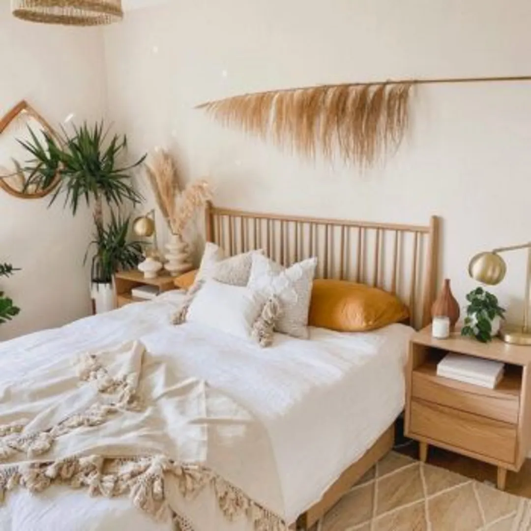 Еще одна отличительная черта дизайна Бохо – изделия ручной работы. Сохраните этот элемент в своей белой спальне, выбрав предметы из натуральных материалов нейтральных цветов. Создайте акцентную стену над изголовьем кровати. Установите плетеные корзины, высушенные пальмовые листья или повесьте большой настенный свисающий светильник.