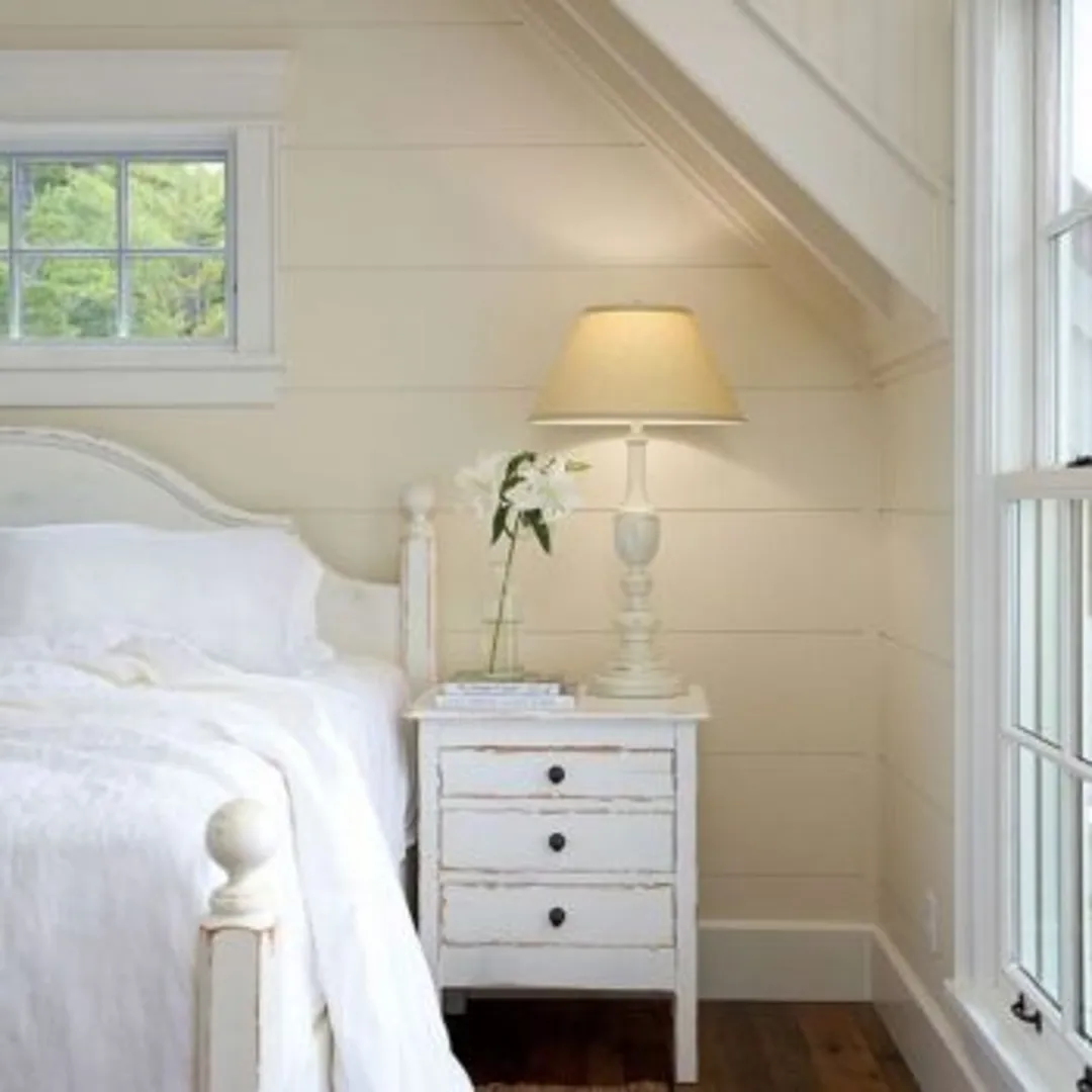 Если вы планируете создать в своей спальне атмосферу деревенского или фермерского дома, вам необходима стена из деревянных досок. Она образует фокусную точку в комнате, придает спальне деревенский стиль и добавляет текстуру к полностью белой цветовой палитре. Деревянную стену можно покрасить или приобрести уже загрунтованную или окрашенную. Для достижения деревенского стиля побелите деревянную обшивку, чтобы она выглядела потертой и обветренной.