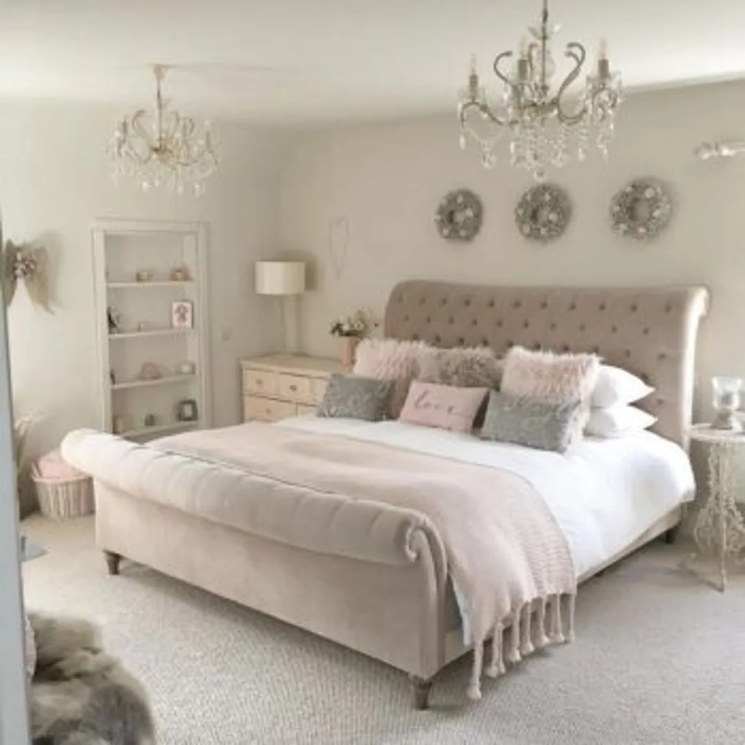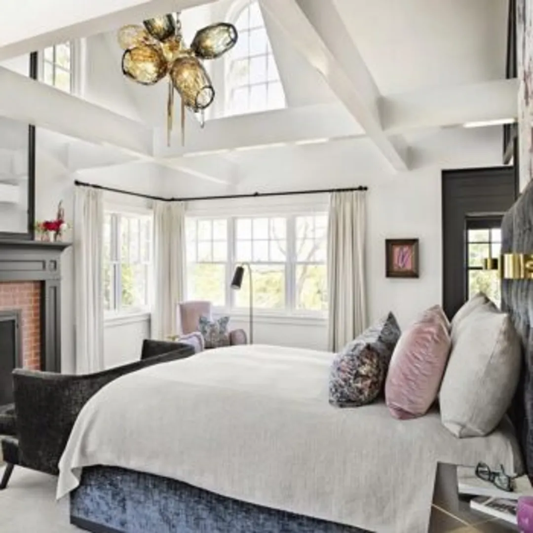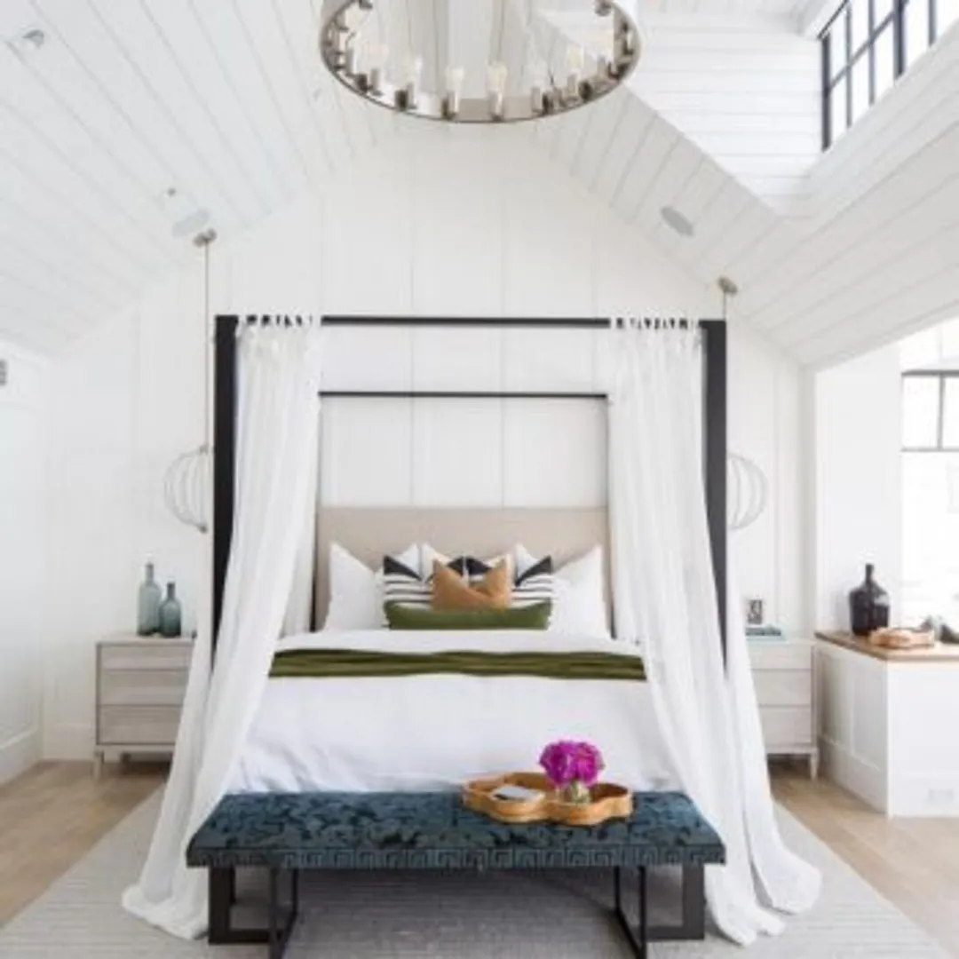 Начните с текстуры. Выбирайте ткани и материалы, придающие помещению глубину, создавая визуально интересное произведение. Вы можете установить люстру, абажур которой сделан из нескольких слоев белой бумаги, перьев или полупрозрачных ракушек. Выберите изголовье кровати с мягкой обивкой или с элегантными узорами.