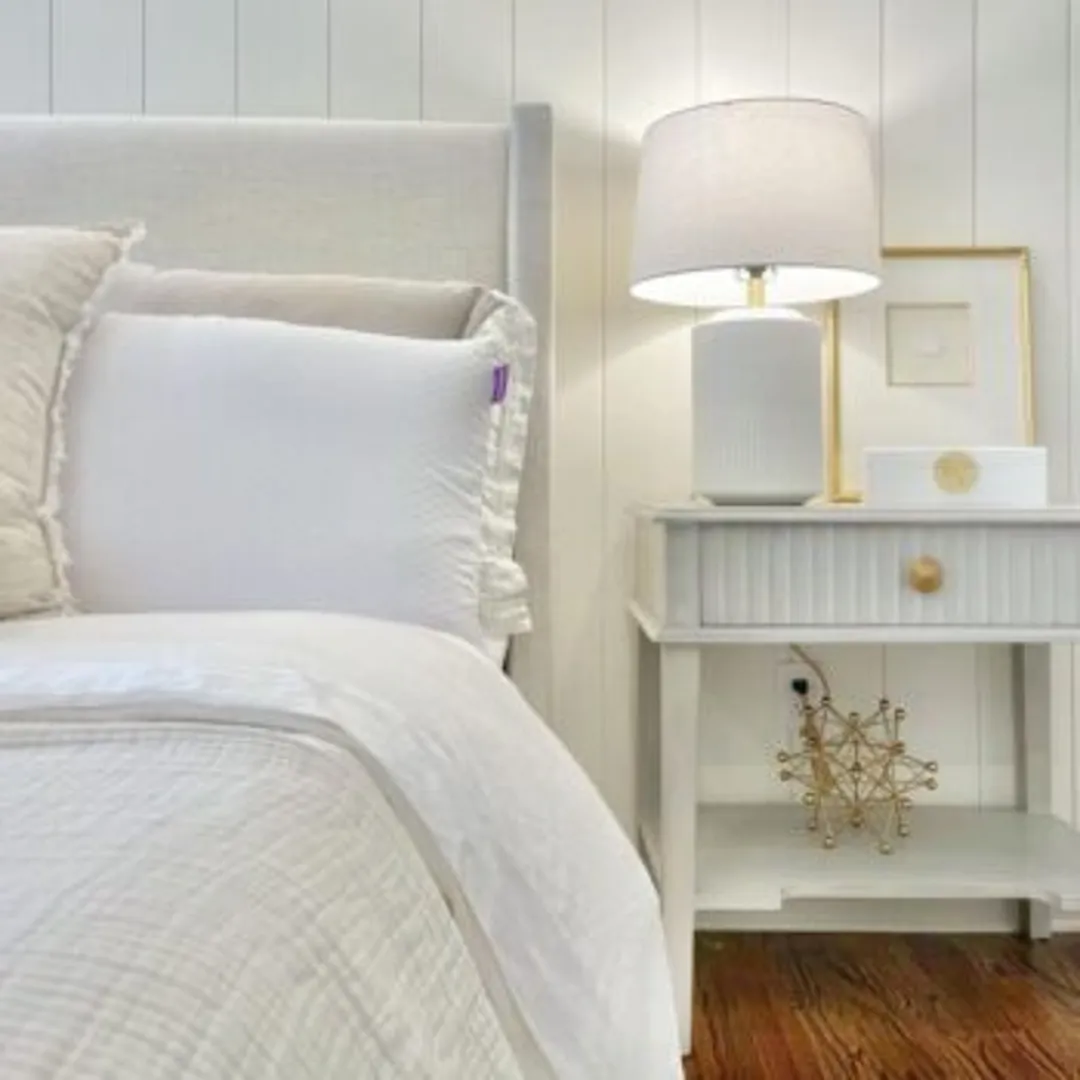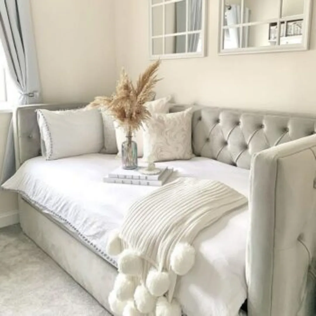 Создание атмосферы уюта в полностью белой комнате зависит от материалов и фактуры. Выберите большой и пушистый плед. Затем выберите белые фланелевые простыни, которые будут приятно обволакивать вас во время сна. Дополните кровать большими подушками из меха, мохера или плетеной пряжи.