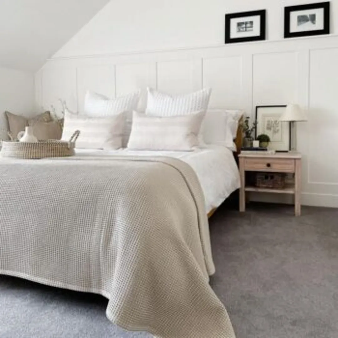 Далее, не все в вашей спальне обязано должно быть идеально белым. Существует миллион оттенков белой краски, воспользуйтесь ими и найдите более мягкий и теплый оттенок с желтыми или розовыми нотками. Невооруженным глазом цвет будет казаться белым, но при этом создаст более мягкий вид комнаты. Не избегайте нейтральных цветов в качестве акцентных цветов в подушках, покрывалах или оформлении спальни. Эти тонкие акценты добавляют детали и завершающий штрих комнате.