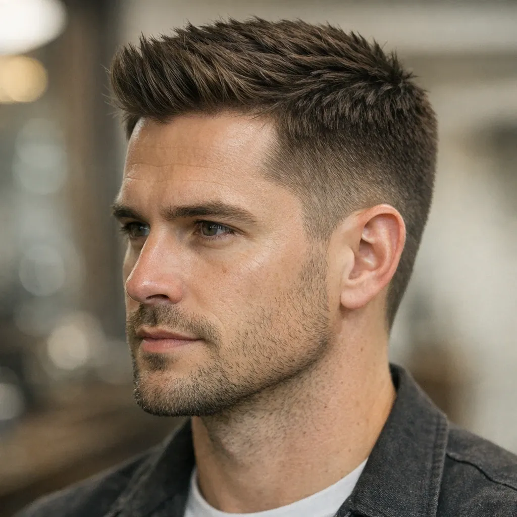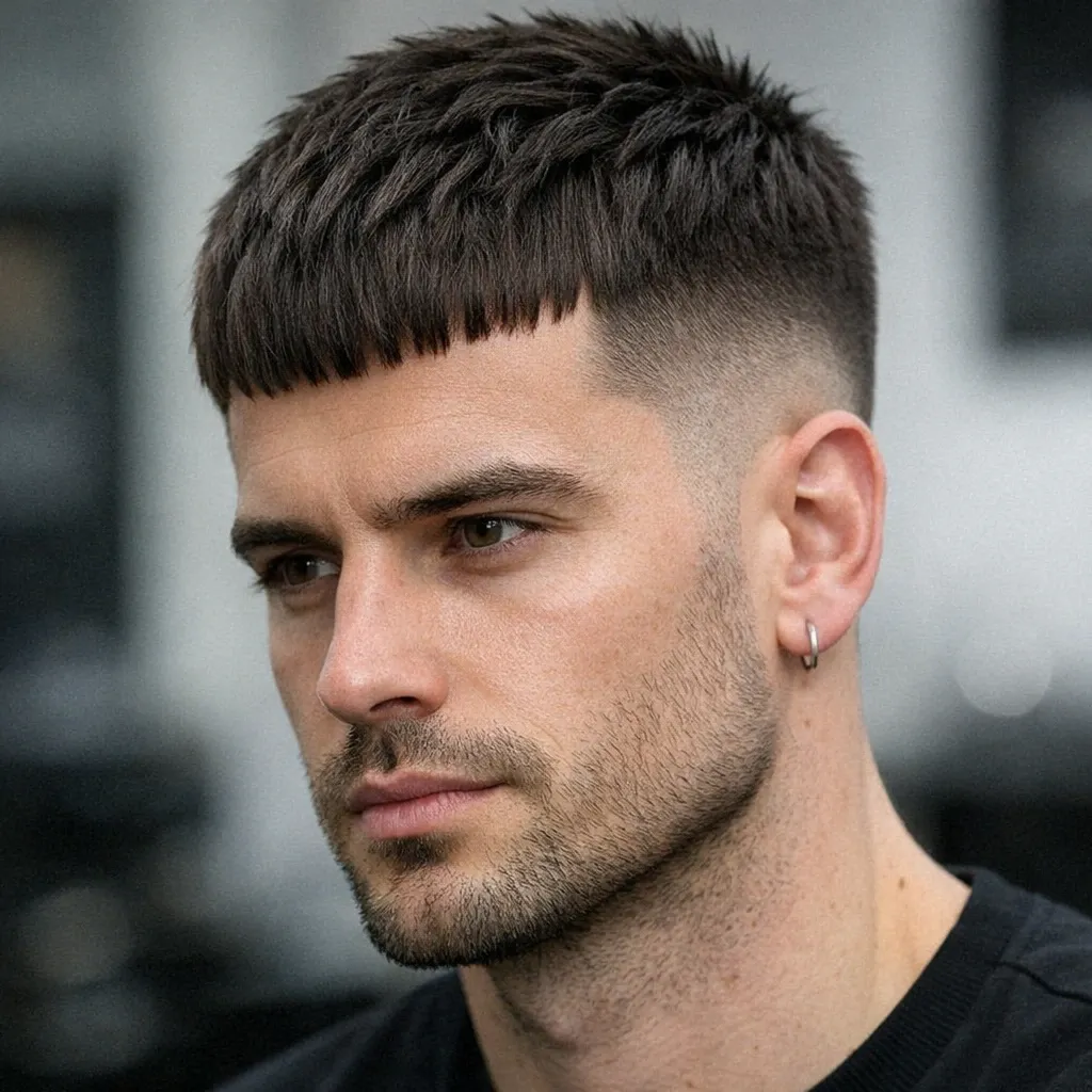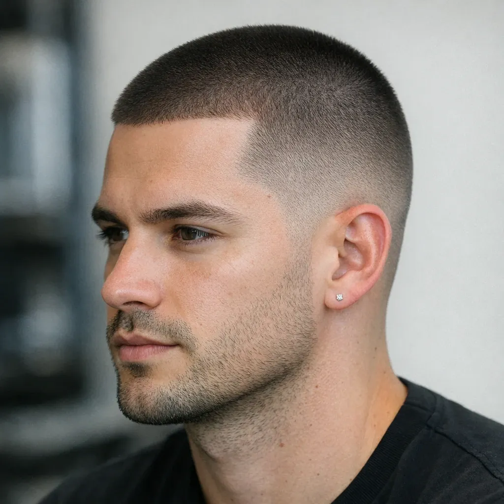 Что сказать барберу: «Buzz cut с фейдом: сверху, например, насадка №3, по бокам — плавный фейд до 0/0,5, без резких линий.»