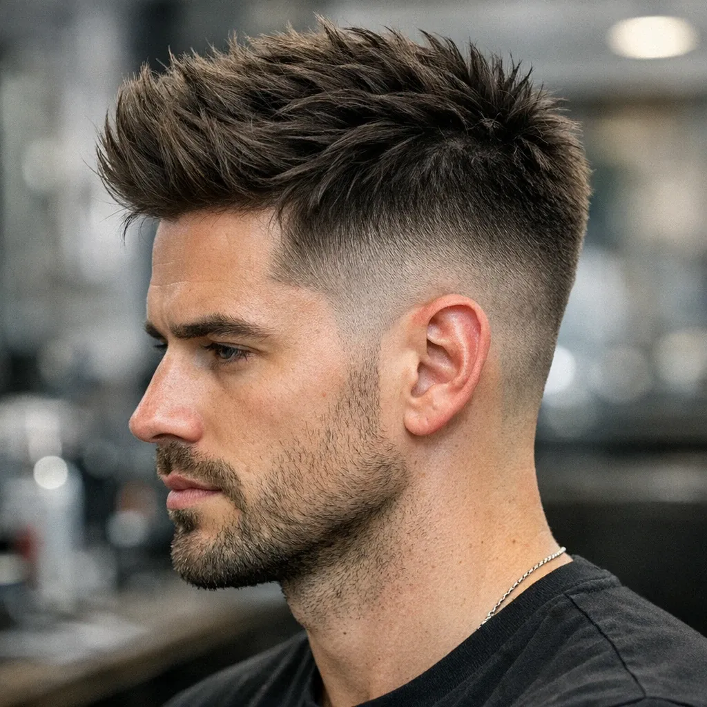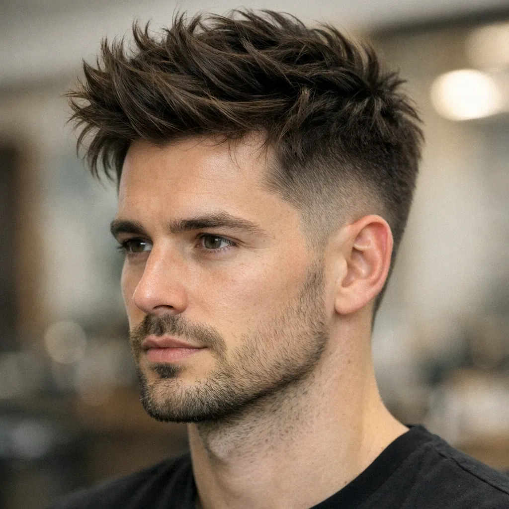 Удлинённая зона чёлки и макушки (5–8 см), поднятая вверх и чуть назад. По бокам — мягкий средний фейд или taper, линия не слишком резкая.