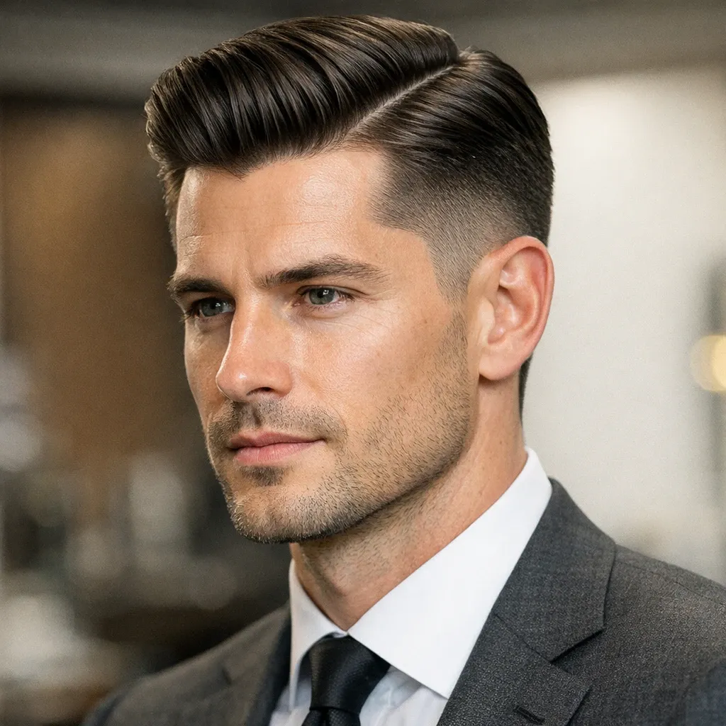 Волосы средней длины (5–7 см) с чётким или естественным пробором, гладко уложены набок. Бока — укорочены, но не выбриты, плавный переход.
