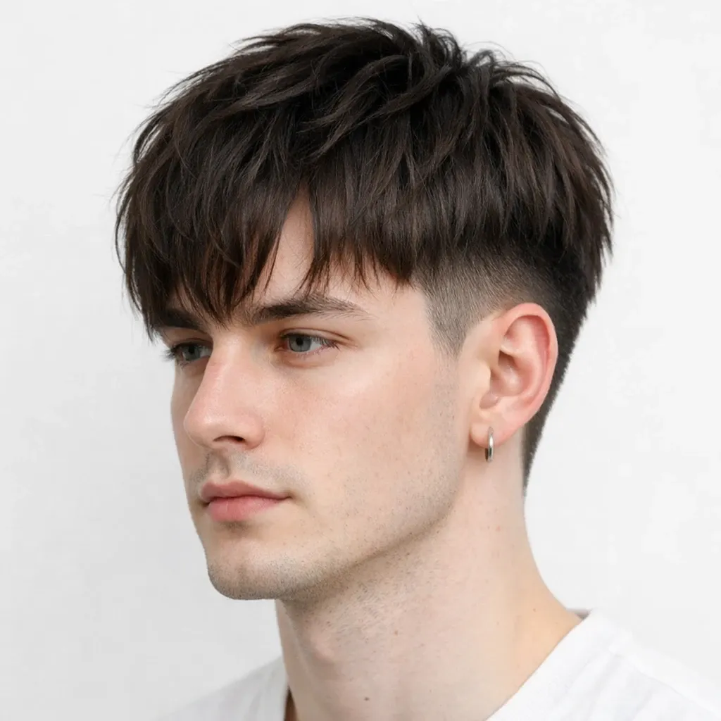 Короткие затылок и виски, плотная макушка, короткая либо средняя челка с рваными, текстурированными краями. Силуэт — чуть округлый, без "ёжика".