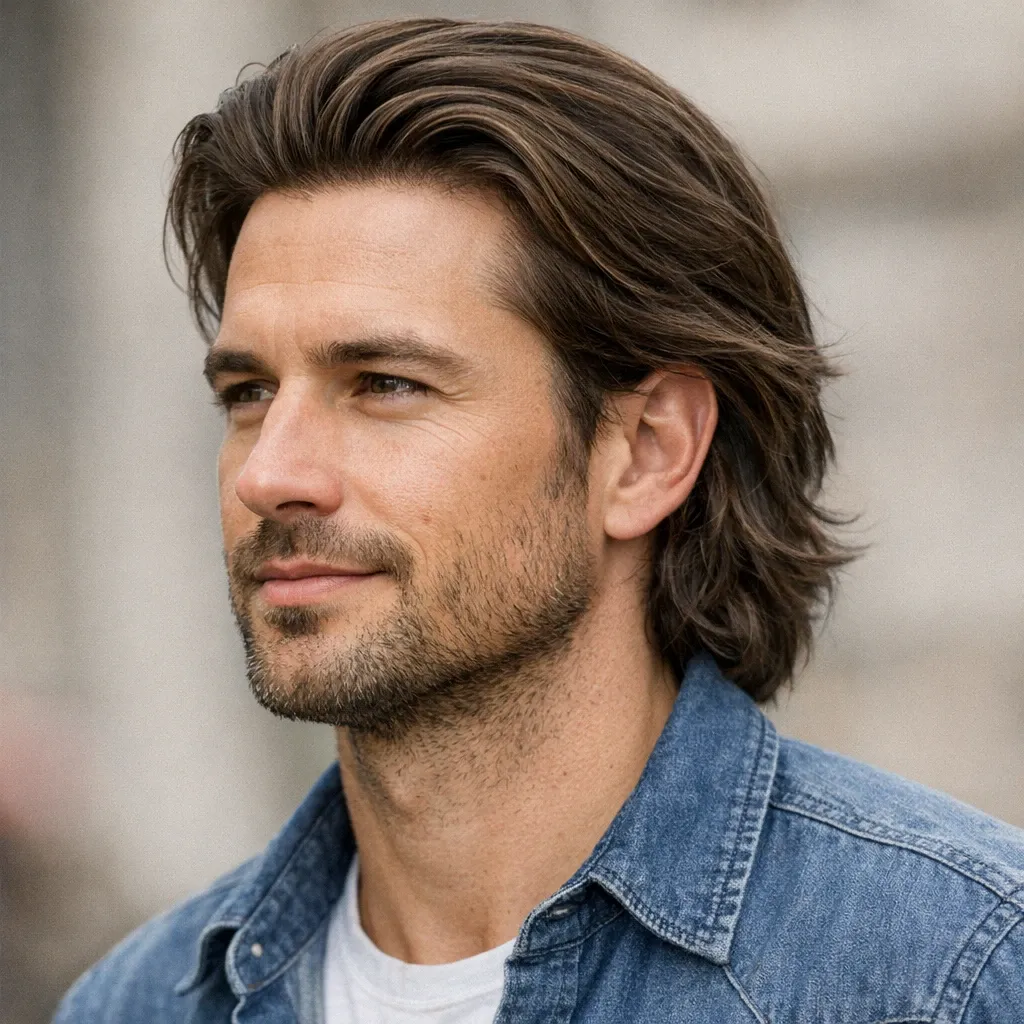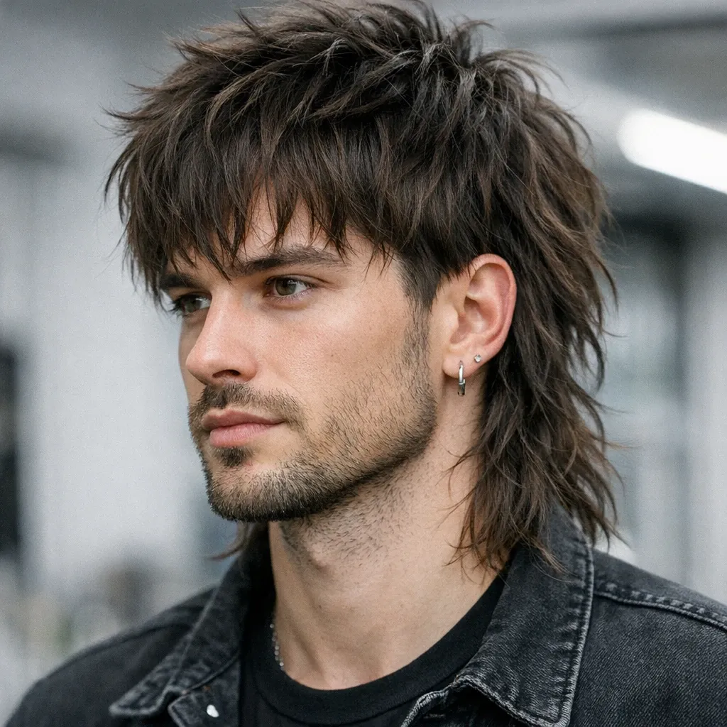 Что сказать барберу: «Современный маллет/wolf cut: короче по бокам, спереди не слишком длинно, сзади — явное удлинение. Много текстуры, чтобы не было эффекта “рыбий хвост”.»