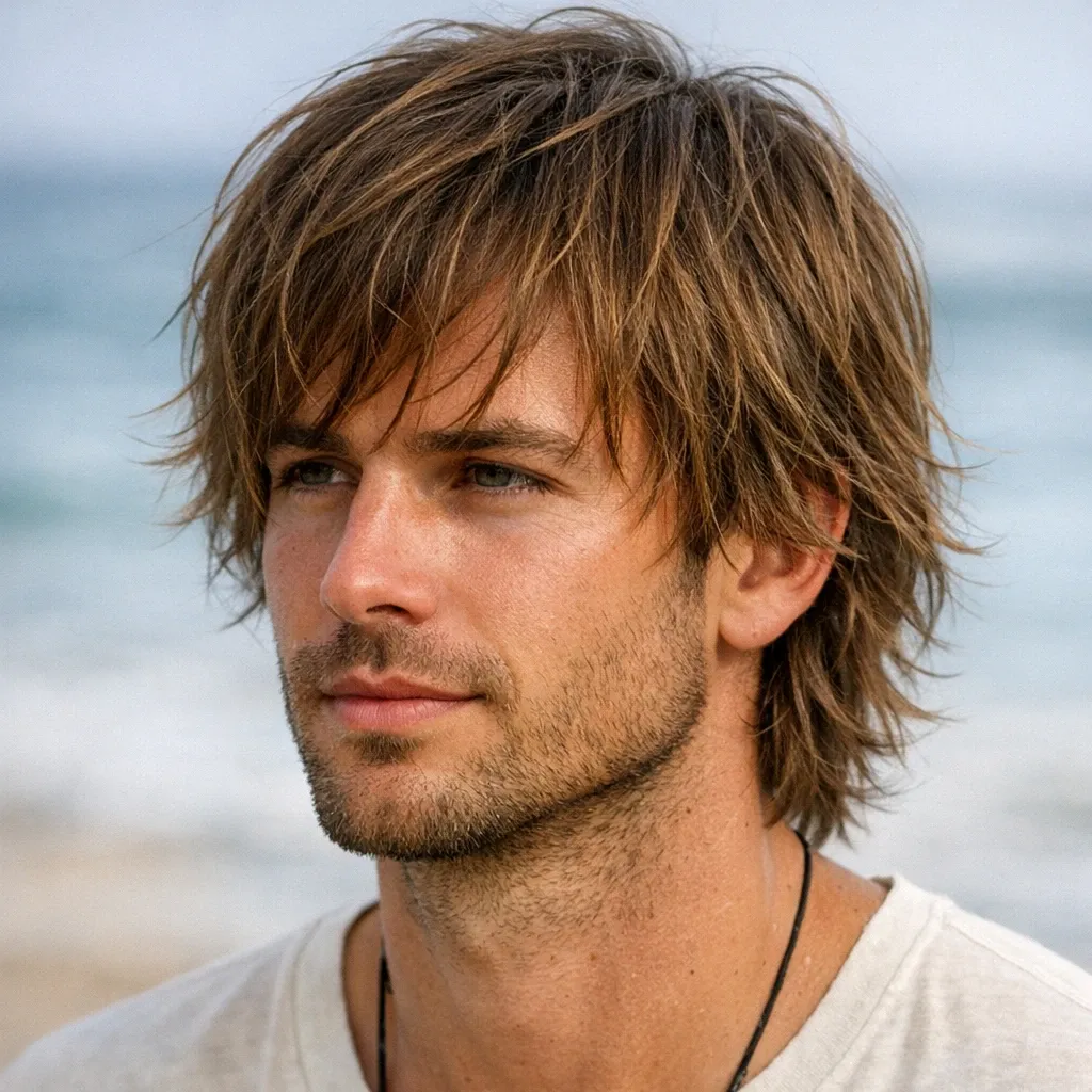 Что сказать барберу: «Слоистый shag/surfer: длина примерно до ушей, много текстурирующих срезов, без чётких линий, чтобы волосы сами падали, как после пляжа.»