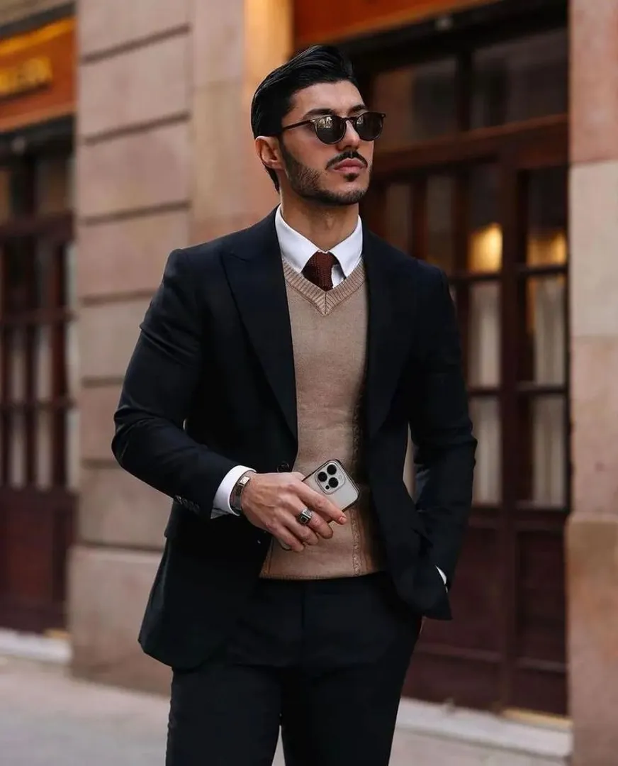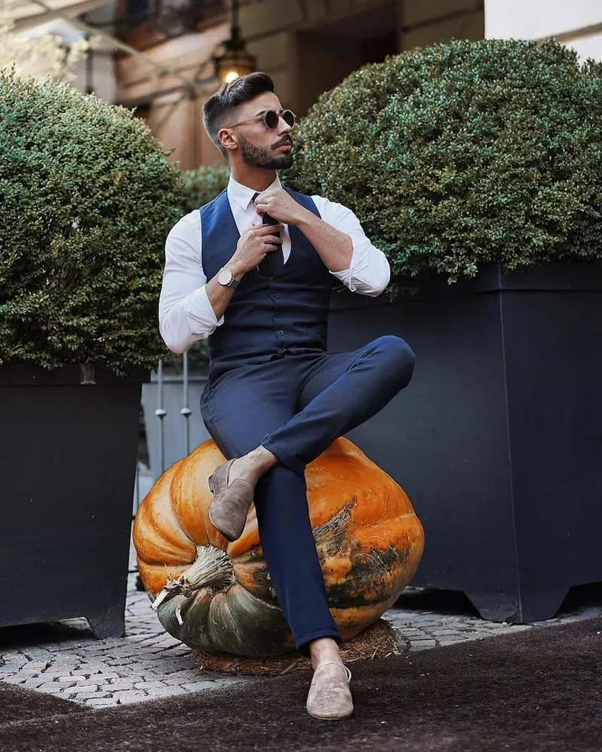 Независимо от того, какой жилет на вас надет (от костюма или вязанный шерстяной), – вы можете выбрать этот образ и использовать жилет как верхнюю одежду, так и в качестве среднего слоя. Костюмный жилет с подходящими к нему брюками, белой рубашкой на пуговицах с длинным рукавом и кожаными туфлями – это «нарядный» вариант. Впрочем, вы можете сделать образ более повседневным, сочетая ту же рубашку и жилет с тёмными джинсами и кроссовками или заменив жилет на жилетку из другой ткани.