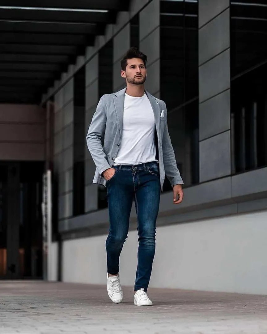 Деловой и по совместительству повседневный стиль имеют всего несколько степеней различий. Если надеть серый или нейтральный костюм с чёрной футболкой и белыми кроссовками, ваш образ будет выглядеть более раскрепощённым, но аккуратным. Если вы ищете уникальный подход, попробуйте сочетать брюки от костюма и подходящий жилет без блейзера с пиджаком в стиле Милитари и чистыми белыми кроссовками. Бонусные очки, если ваш костюм будет в полоску или клетку.
