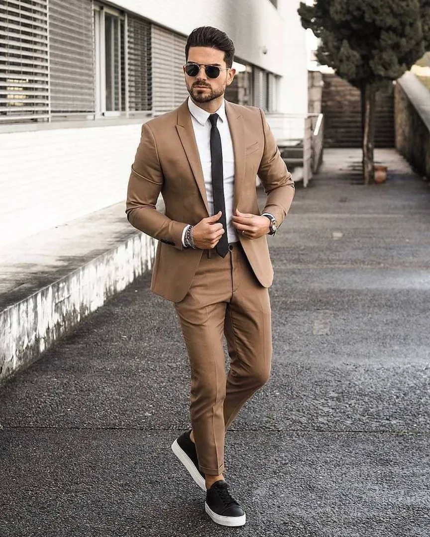 Лично для нас это самый оптимально-комфортный и полуофициальный стиль. Приталенный, грамотно сшитый костюм с узким галстуком и кроссовками никогда не будет ошибочной идеей. Брюки по щиколотку идеально подходят к кроссовкам, но, если ваши брюки немного длинноваты, закатайте их на 2-3 раза – сегодня это в тренде. Только не одевайте носки. Если вы хотите придать образу еще больше комфорта, откажитесь от рубашки на пуговицах и галстука, а вместо них наденьте подходящую нейтральную футболку, заправленную в ремень.