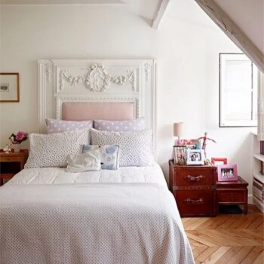 Можете свободно применять цвета, необычные для традиционного декора винтажной спальни. Плетеную спинку кровати покрасьте в ярко-розовый, к старинной тумбочке добавьте пурпурные ручки от комода. Воткните фигурку розового фламинго в горшок с цветком, поверх стопки белых кружевных подушек бросьте подушку с серебристыми звездами.