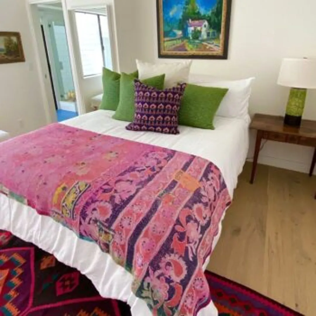 Возможно, в викторианский период было не принято использовать меховые подушки рядом с узорами мандалы, но в современном смешанном винтажном пространстве комбинированный декор срабатывает. Яркие краски, смешанные ткани помогают усилить впечатление от небольшой спальни.
