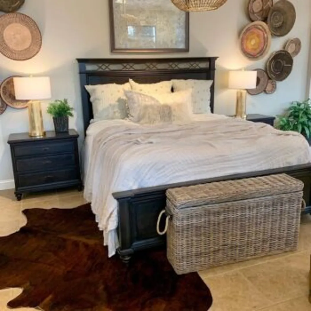 Внесите в фермерскую спальню много натуральных тканей. Широкие вязаные одеяла, вышитые простыни, плетеные корзины, открытые деревянные балки и множество металлических акцентов – обязательные атрибуты фермерского стиля. Для оживления пространства добавьте пару живых растений в стеклянной посуде или глиняном горшке.