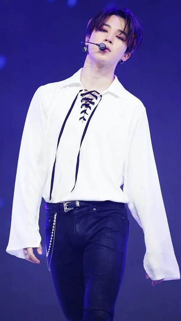 Средневековый крестьянский топ не обязательно должен принадлежать актерам шекспировской драмы. В этом наряде Чимин показывает нам, что можно взять старый стиль и сделать его модным с помощью ультрасовременных брюк.