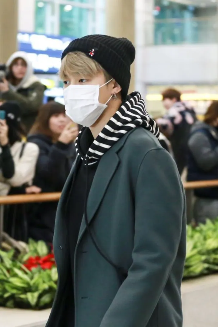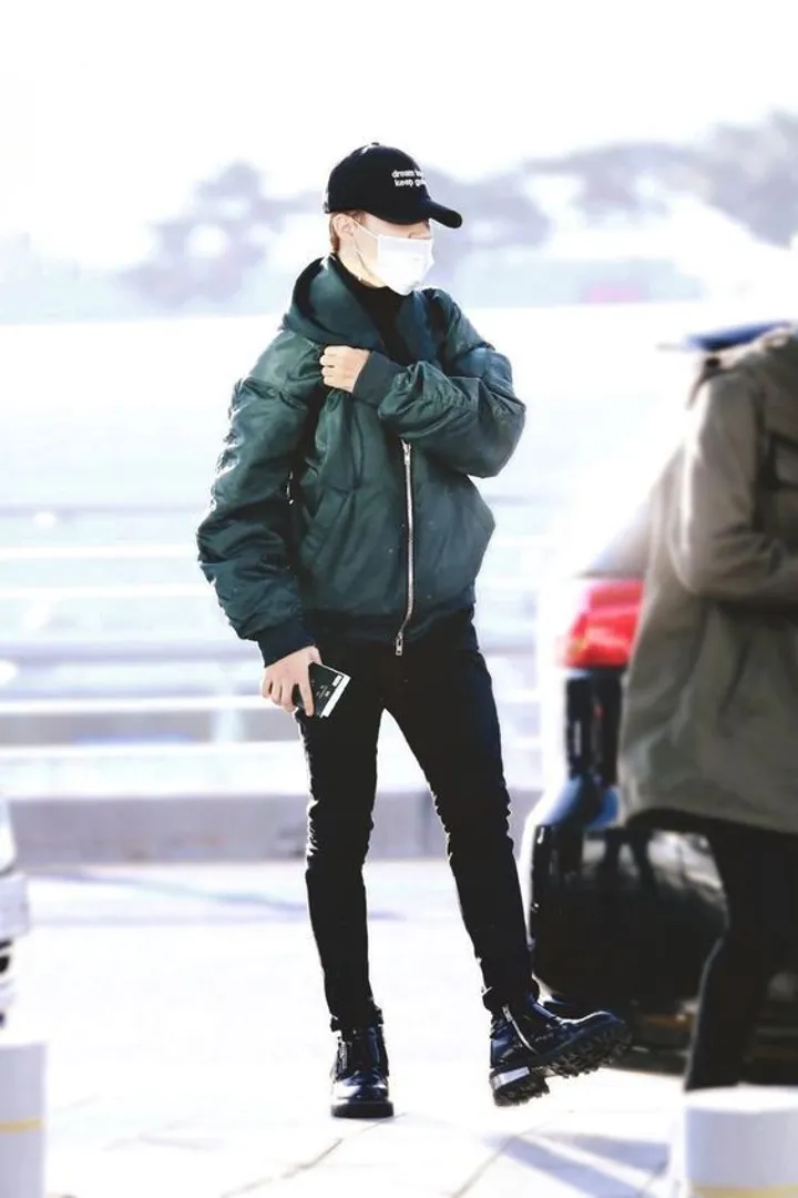 Мы снова в аэропорту, но на этот раз Чимин одет в модное серо-зеленое пальто поверх черного худи с капюшоном. И снова это прекрасный пример сочетания современного и классического стилей.