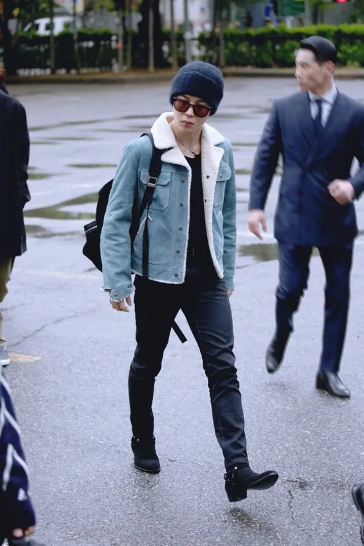 Чимин остается модным и одновременно сохраняет тепло, благодаря пышной сине-зеленой куртке. Он сочетает ее со своими фирменными черными джинсами скинни и высокими ботинками.