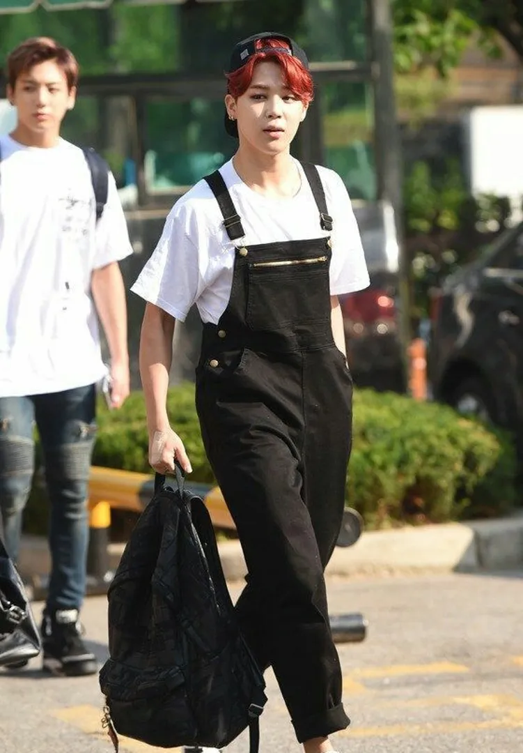 В этом стиле Чимин демонстрирует, как мужские комбинезоны могут быть модными, особенно если вы слегка закатаете их на лодыжках и будете сочетать с простыми кроссовками.