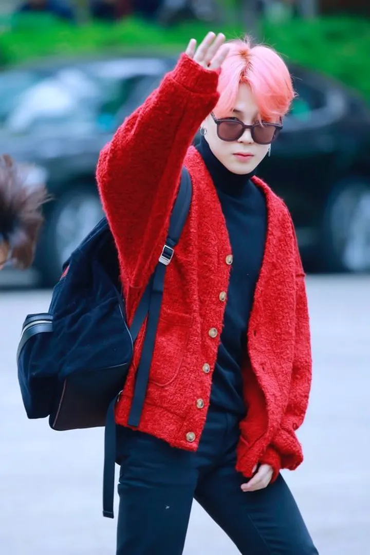 Чимин снова добавляет яркости своему образу с помощью ярко-красного удобного кардигана. Этот легкий стиль сегодня очень популярен, его объем хорошо контрастирует с обтягивающими джинсами и блестящими кожаными туфлями.