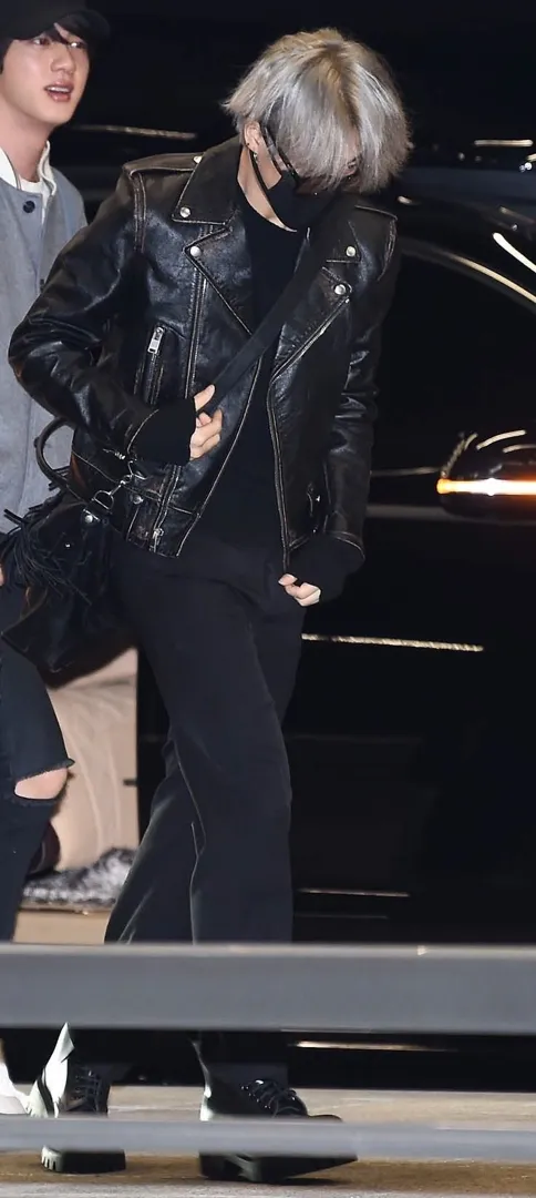 Для наряда, Чимин использует обычную куртку и объединяет ее со всем своим черным ансамблем, в комплекте с черным поясом, черными солнцезащитными очками и, конечно же, черной шапочкой.