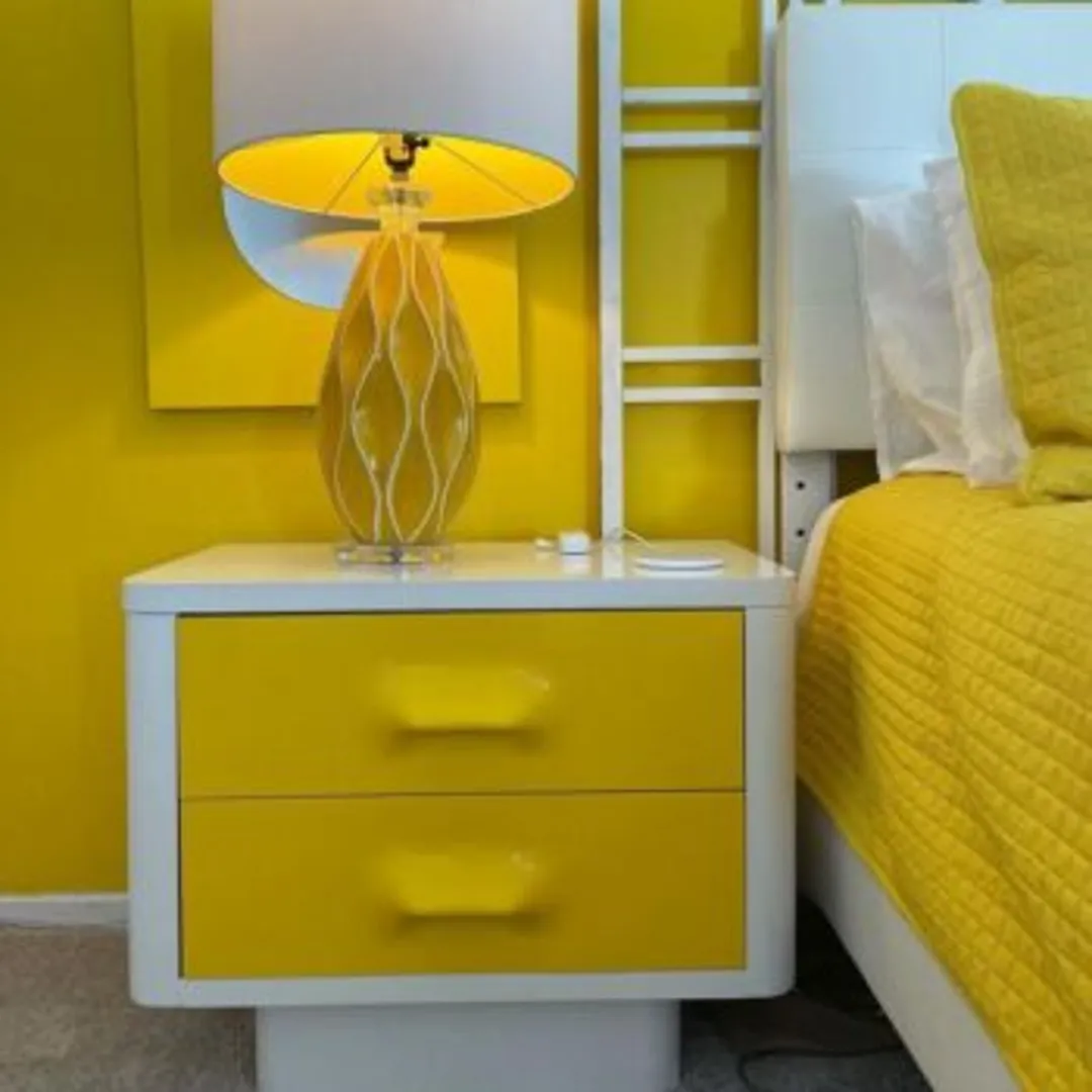 Рассмотрите все способы добавить желтый цвет неожиданным образом. Например, можно использовать желтые светильники. Или тумбочки или стол с металлическими ножками. Покрасьте их рамы в ярко-желтый цвет, а не оставляйте металл. В спальне можно поставить письменный стол или туалетный столик с желтой столешницей и металлическими ножками.