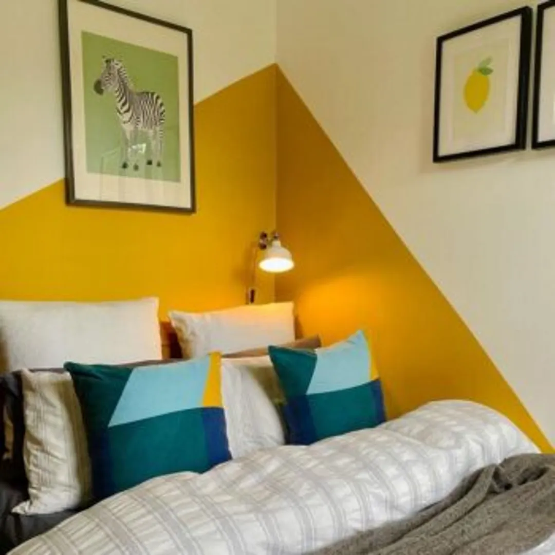 Если вы беспокоитесь, что полностью желтая акцентная стена – это перебор, попробуйте создать на стене своеобразный узор. Вы можете покрасить только половину стены или нанести полоски. Можно также сочетать желтую краску с белой, другим подобным оттенком или другим цветом.