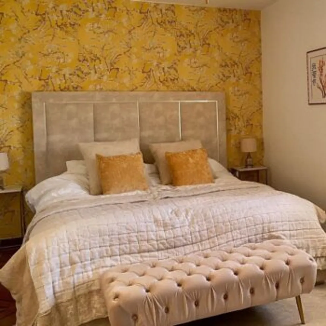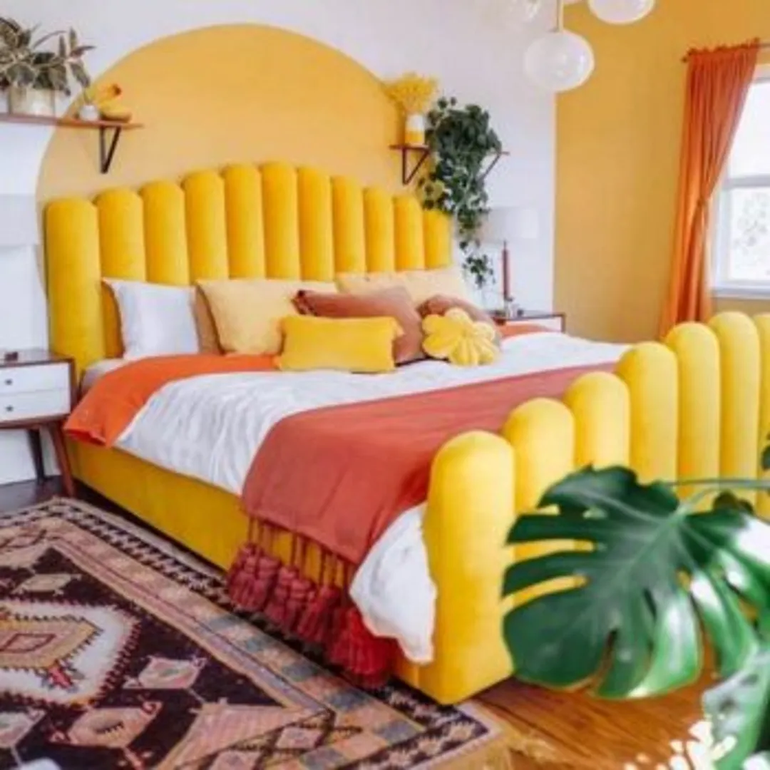 Поскольку кровать, как правило, в комнате является главным центральным элементом или фокусной точкой, желтый цвет естественно бросается в глаза. Для создания яркого образа выбирайте кровать с желтой велюровой или бархатной обивкой.