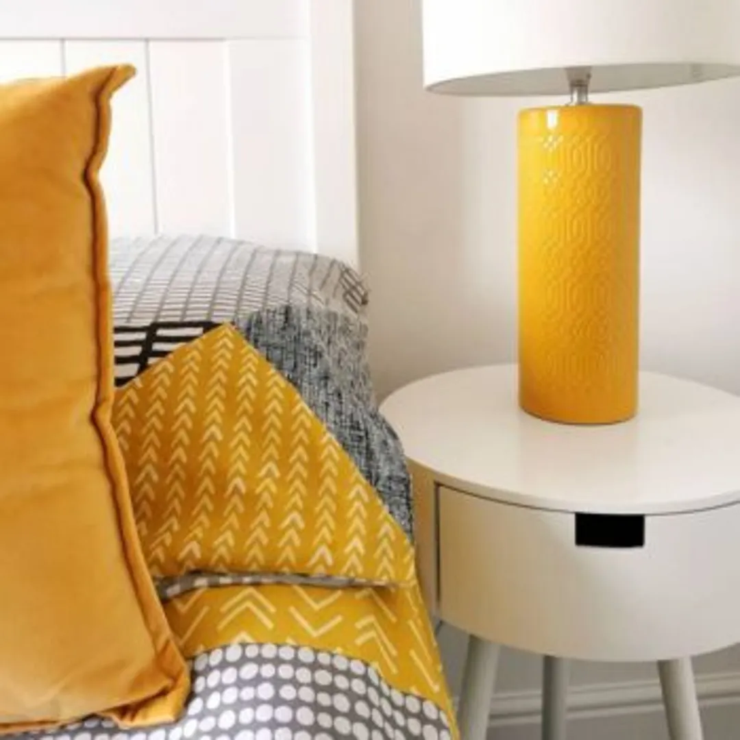 Попробуйте задействовать выбранный вами оттенок в различных элементах комнаты, чтобы связать все воедино. Используйте узорчатый ковер с желтыми оттенками в его переплетении. Затем идентичные акценты могут появиться на шторах, подушках, абажуре настольной лампы, настенном рисунке и постельном белье.