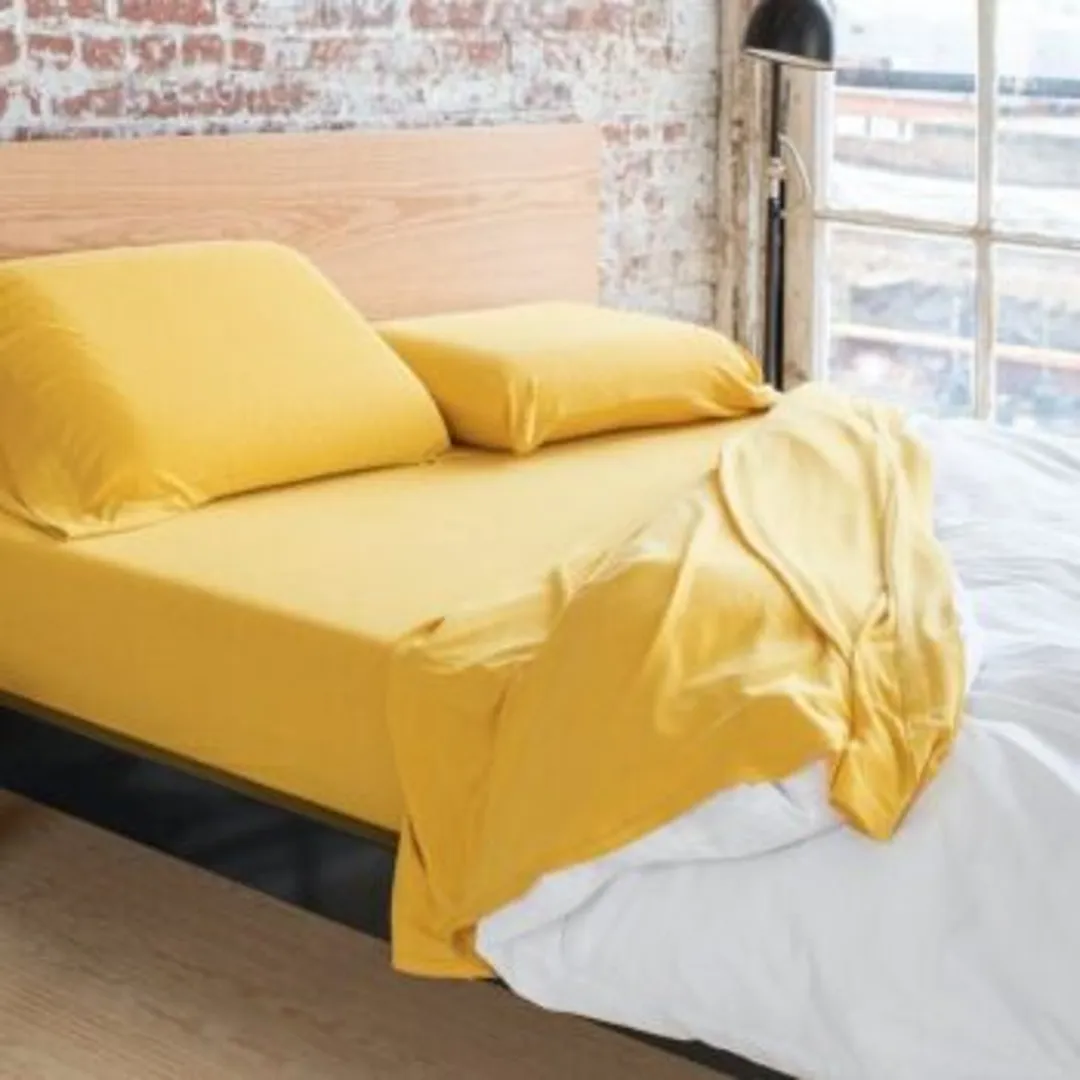 Если ваш бюджет не позволяет приобрести новую кровать, попробуйте сделать акцент с помощью нового постельного белья. Можете использовать однотонный подход и подобрать подушки, покрывало и постельное белье одного оттенка. Или создайте текстуру и четкость, накладывая друг на друга различные оттенки желтого.