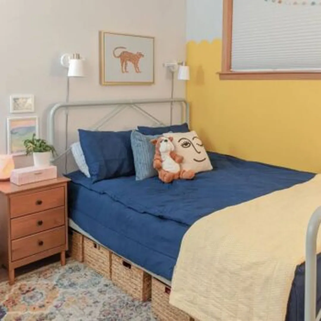 Если вы предпочитаете желтый цвет, но не готовы выбрать подобную палитру для покраски стены, попробуйте использовать его в качестве акцентного. Это может быть 30-процентный цвет в вашей цветовой схеме 60-30-10. Использование желтого цвета для каркаса кровати и постельного белья идеально подходит для этой цели.