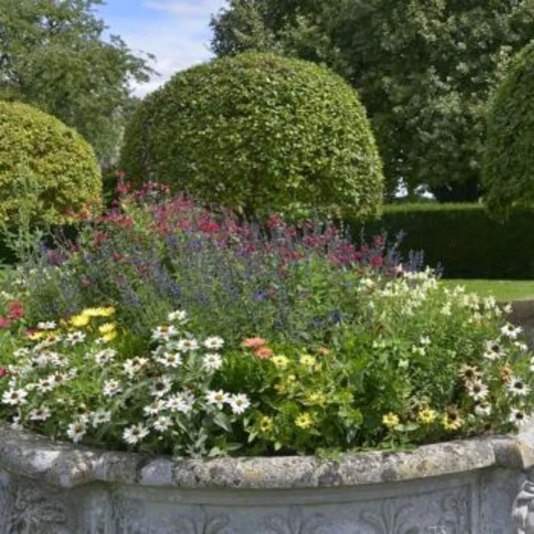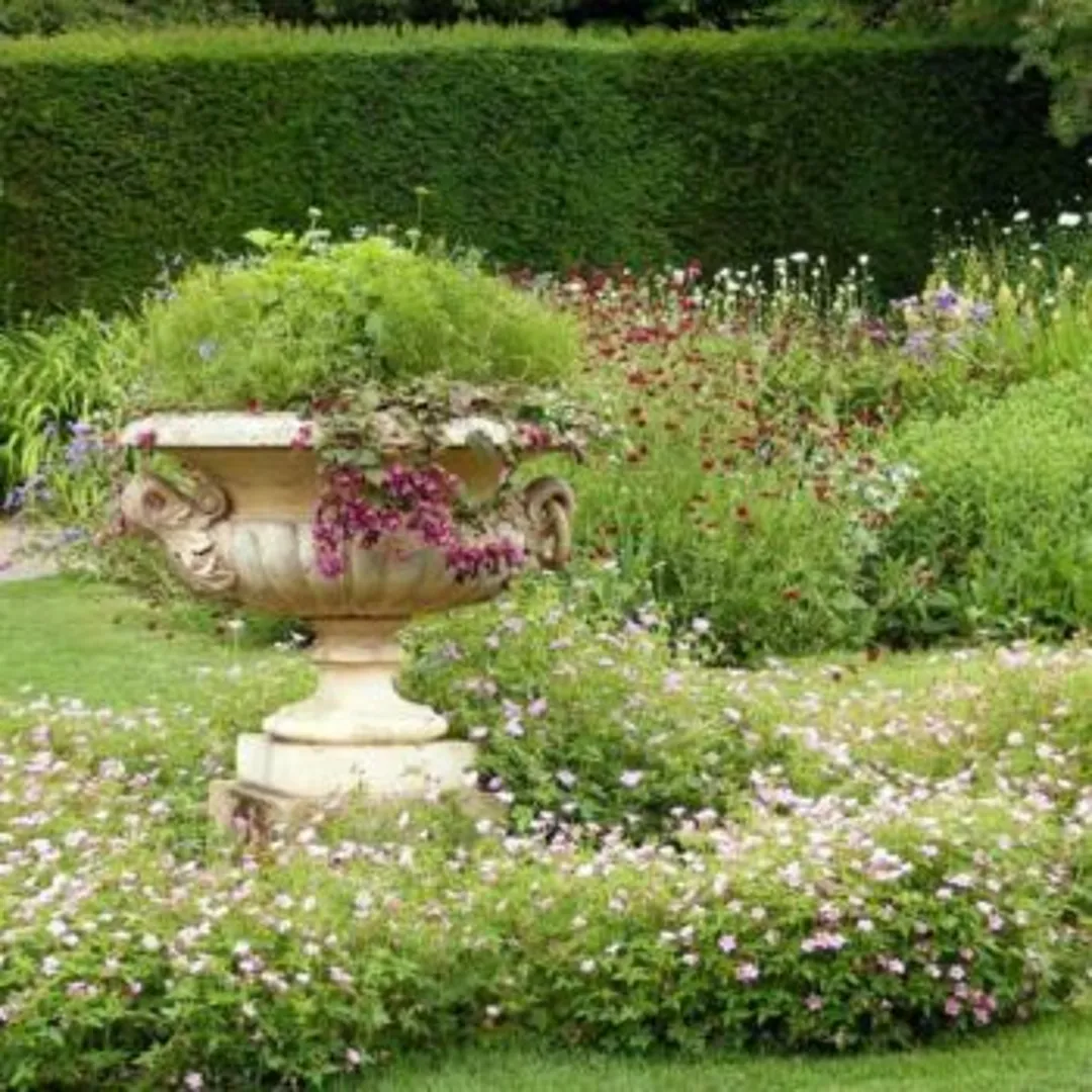Не забудьте включить вертикальные слои в свой английский садовый дизайн. Цветущие деревья – отличный выбор. Вы также можете использовать классические кашпо в окружении наземных растений. Висячие цветы – лучший выбор для этого кашпо.