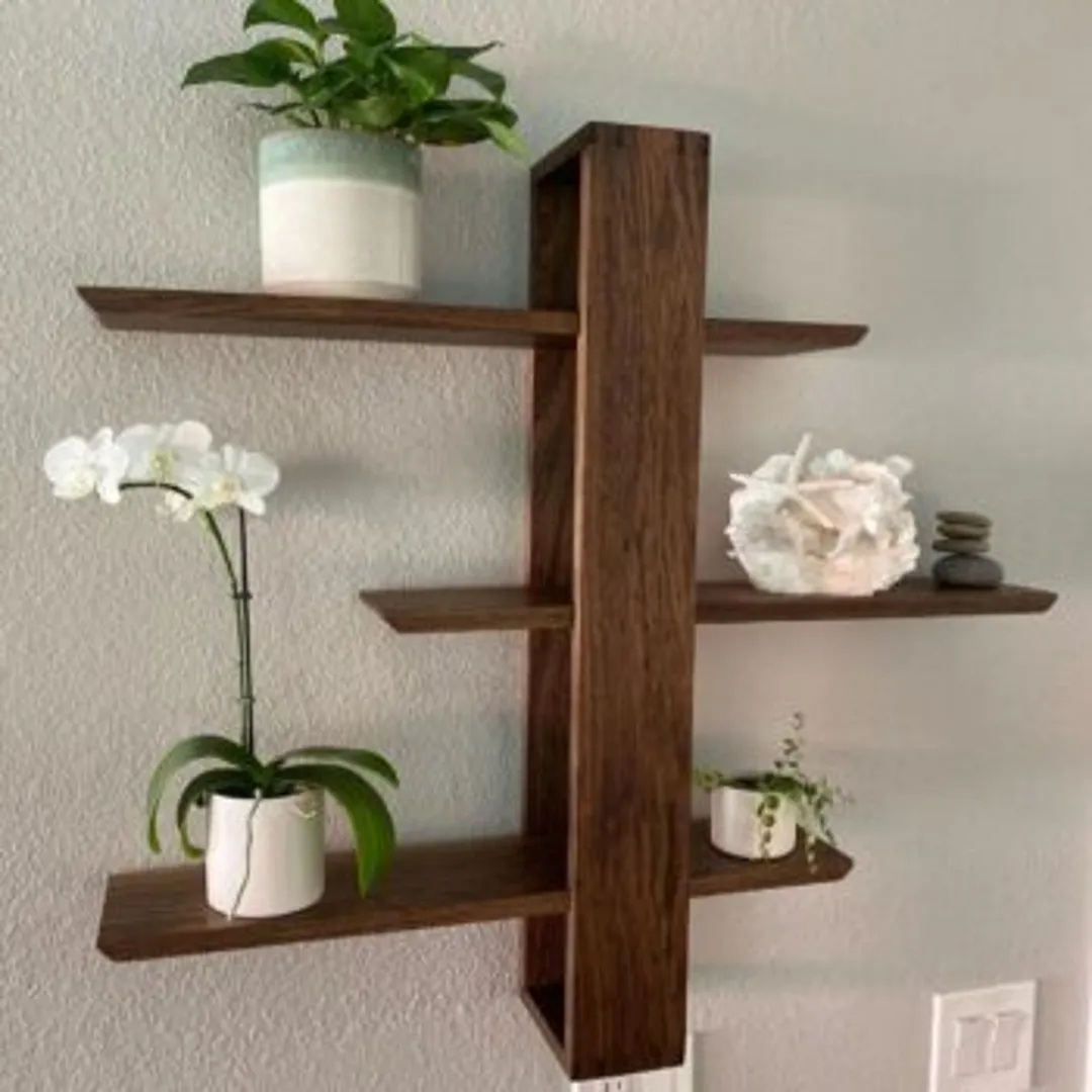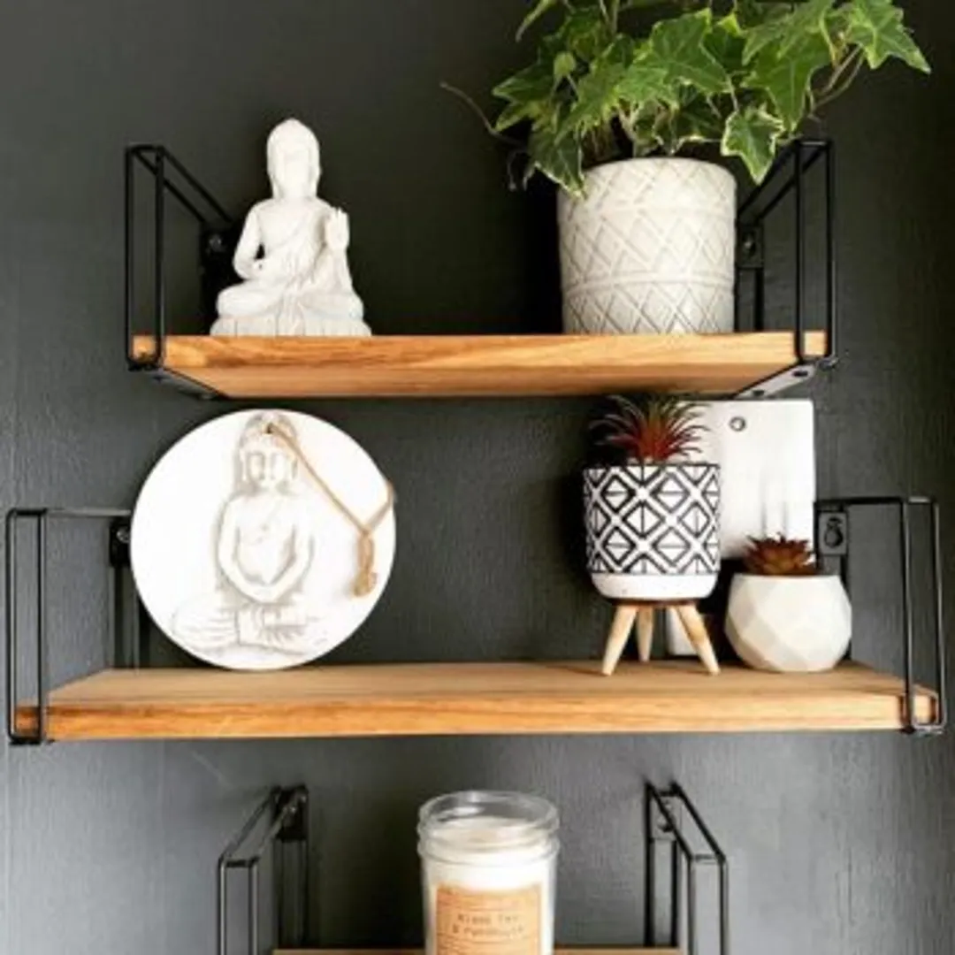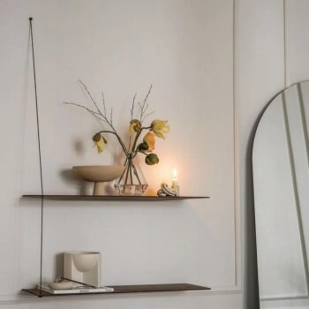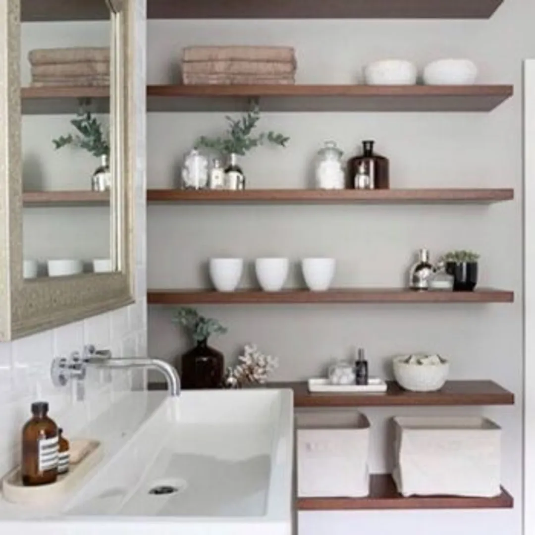 Если ваши запросы более декоративны, чем функциональны, подумайте о подвесных полках. Только обязательно учитывайте весовые ограничения, выбирая предметы, которые будете расставлять.