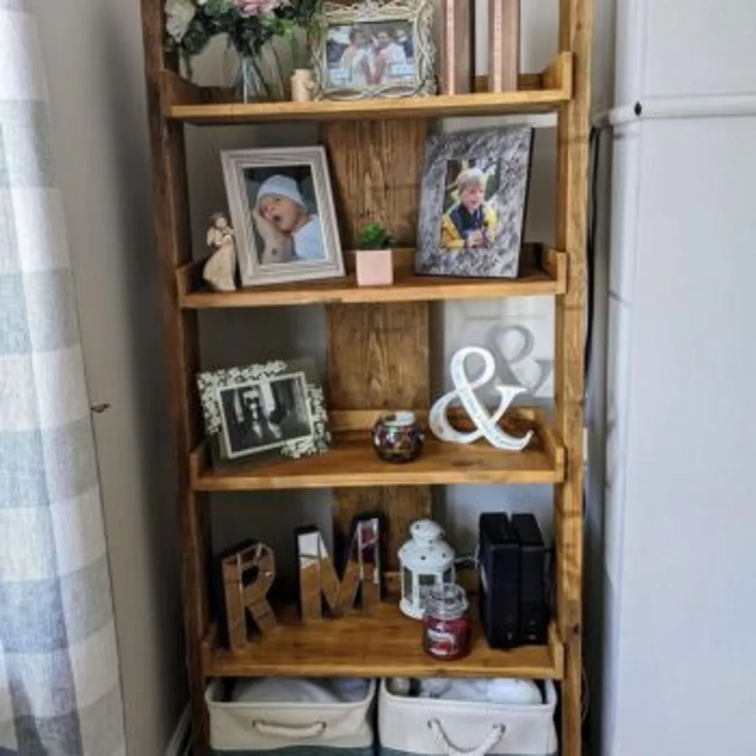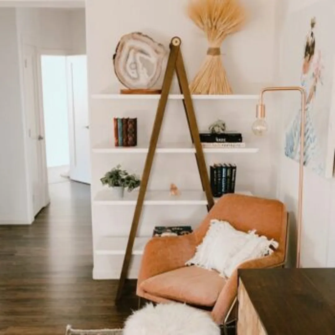 Полочка в виде лестницы – еще одна компактная конструкция, она может служить местом для книг или просто для повседневных вещей. Бывают лестничные полки, стоящие отдельно, прислоненные к стене или подвешенные на стену, такие занимают еще меньше места.