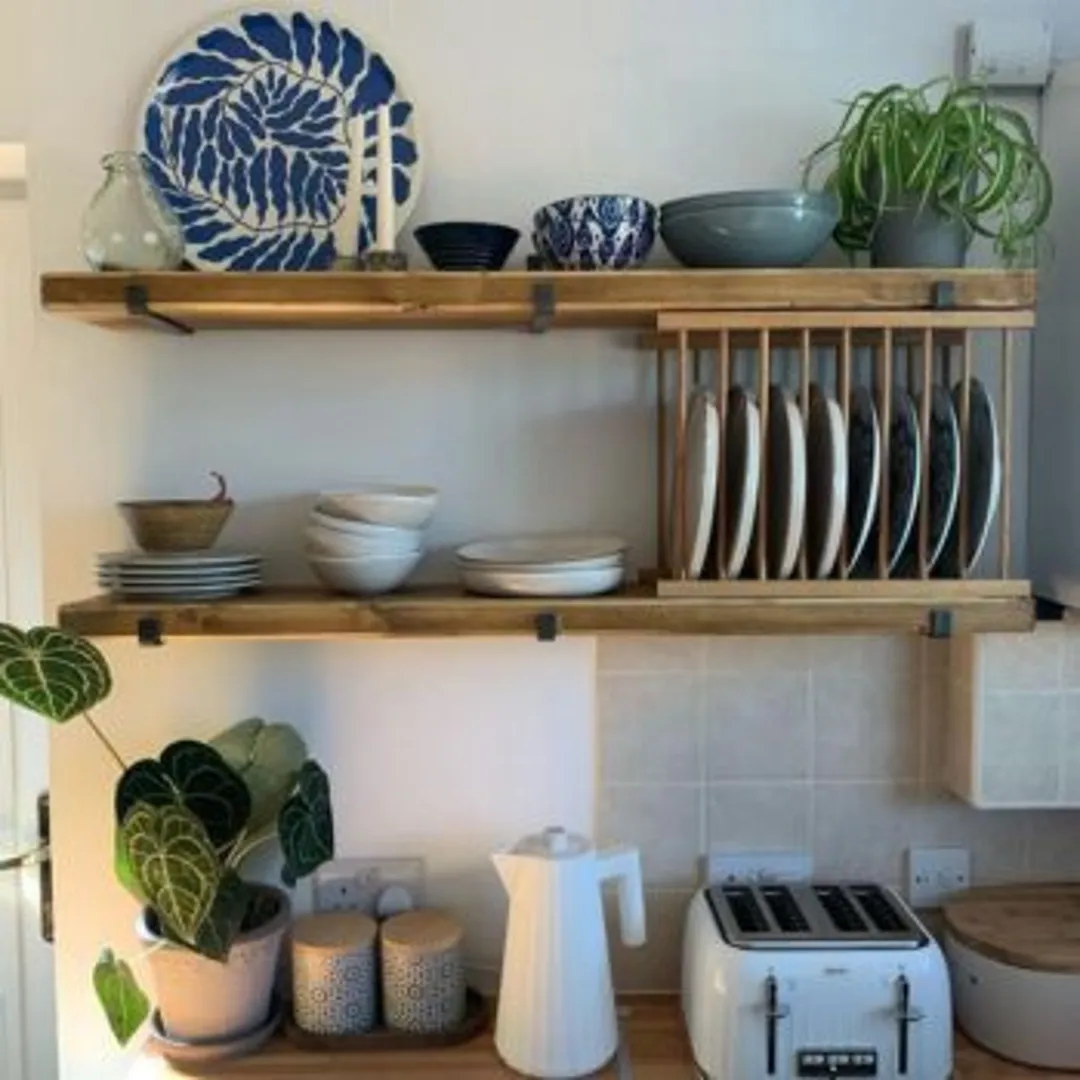 Идей по кухонным стеллажам, из которых можно черпать вдохновение, очень много, так что выбирайте варианты, соответствующие вашему декору. Если у вас кухня в духе фермерского дома, подойдут полки из натурального дерева. Если кухня современная, в ее пространство лучше впишутся блестящие металлические или стеклянные стеллажи.