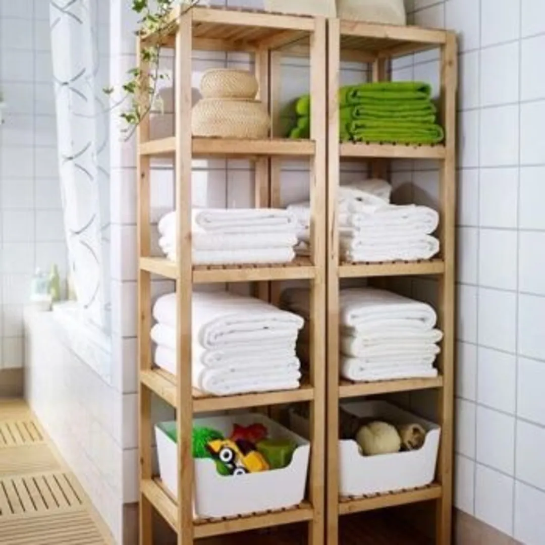 Встроенные полки – отличная альтернатива полноразмерному шкафчику. Всего пара полок обеспечивает достаточно места для хранения полотенец и другого белья, не загромождая и без того маленькую ванную комнату.