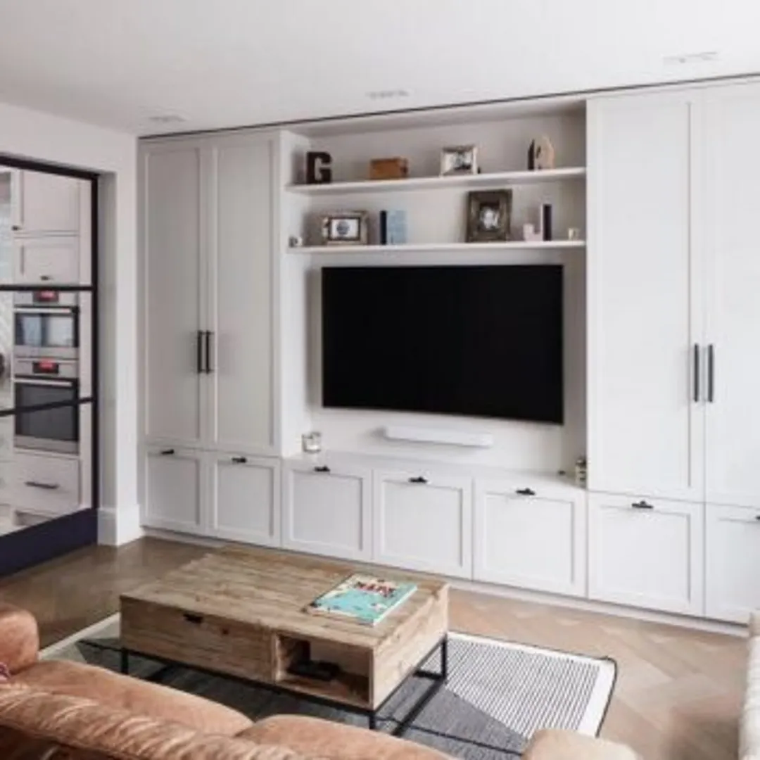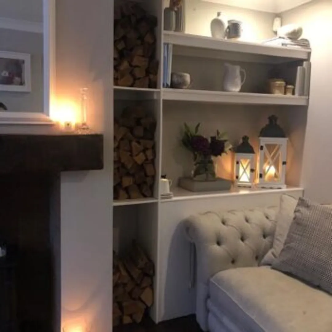 Используйте полки в гостиной, чтобы освободить место для журнального столика, каминной полки или развлекательного центра. Эта комната – идеальное место для демонстрации семейных фото, профессиональных наград и сувениров, которые иначе будут спрятаны в шкафу.