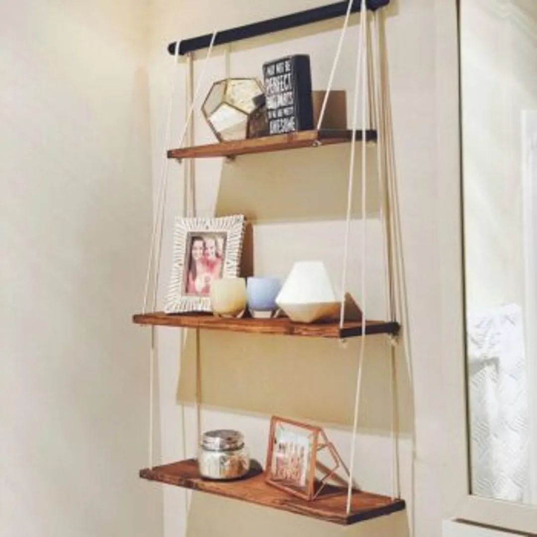 Хотя с концепцией подвесных полок все довольно просто, для окончательного вида имеет большое значение тип используемой веревки и дерева. При деревенском подходе к стилю подойдет толстая веревка и доска из переработанной древесины. Изысканный образ придаст вашей полке веревка из макраме.