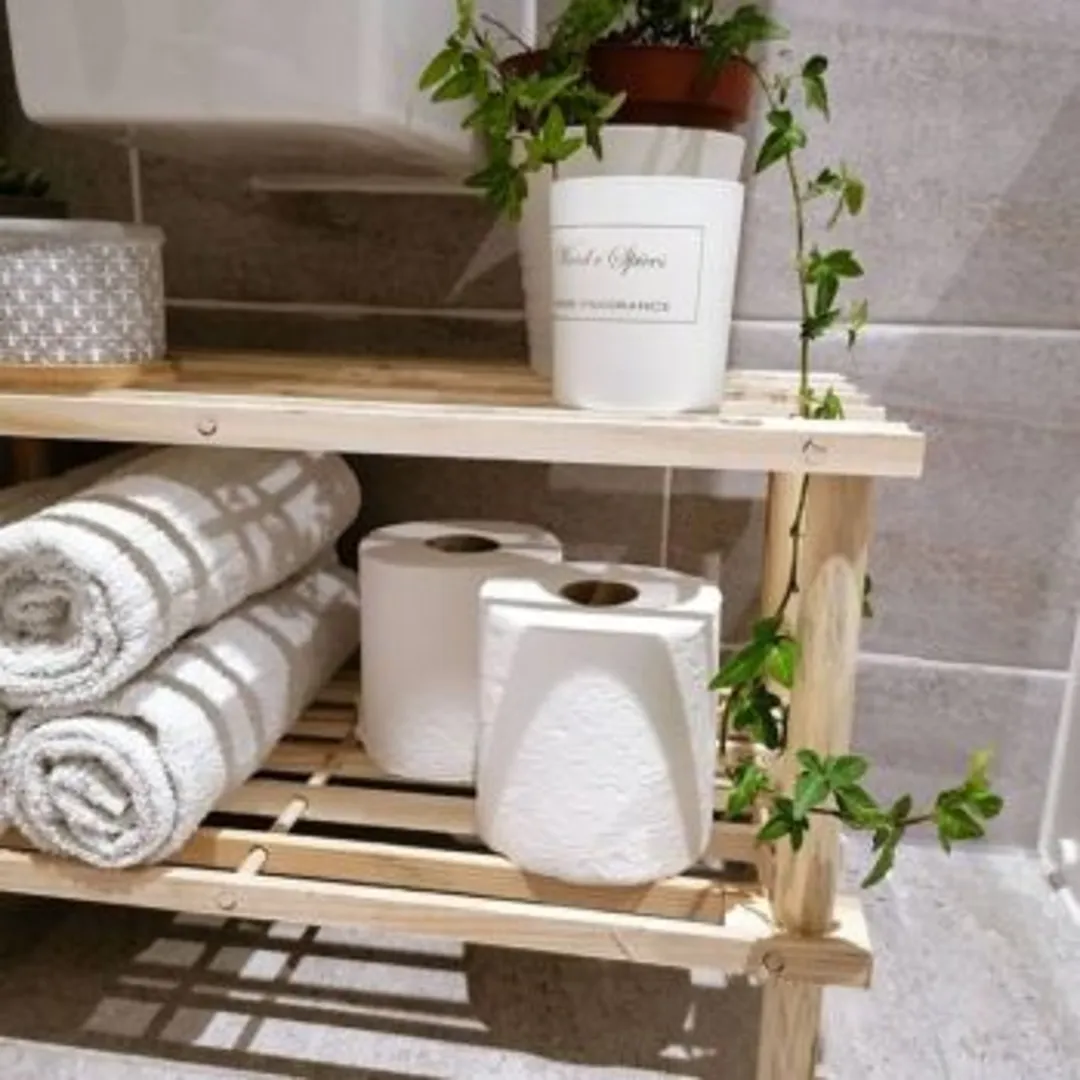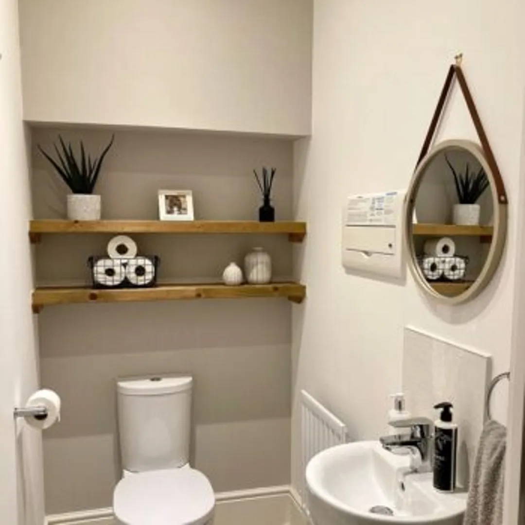 Повесьте открытую полку над унитазом, чтобы на виду были красивые предметы, а туалетные принадлежности храните в другом месте. Это еще и способ держать туалетную бумагу под рукой в гостевой ванной.