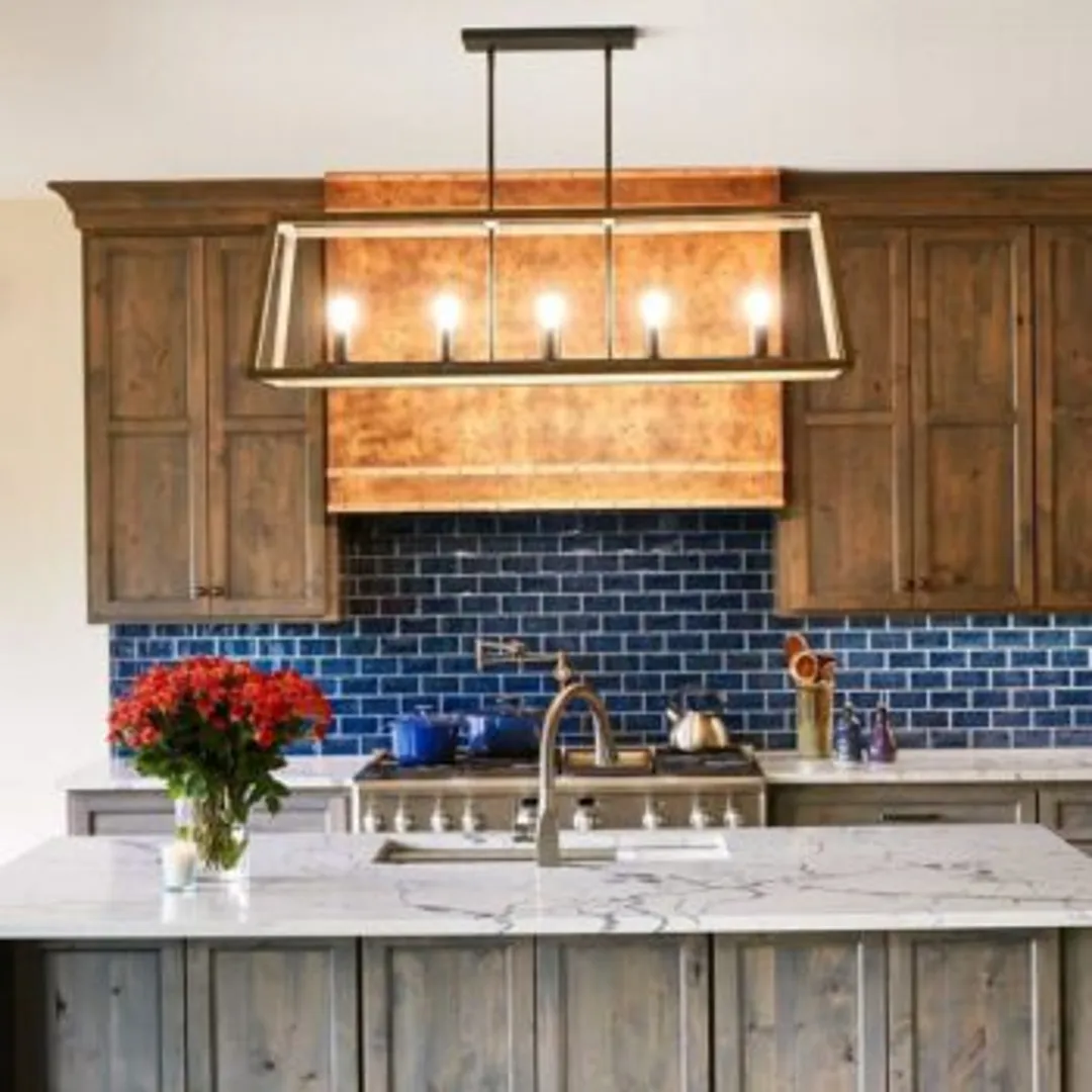 Легкий способ создать винтажный или исторический вид на вашей кухне – это кованная люстра свисающая с потолка. Но не все из нас готовы к таким радикальным решениям. Почему бы не подражать этому образу с помощью металлического фартука. Используйте имитацию стиля из кованых квадратов, только в меньшем масштабе.