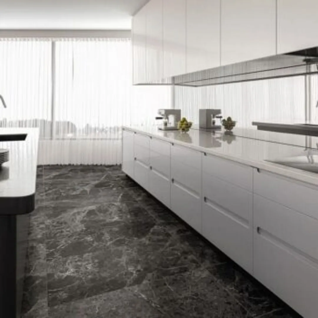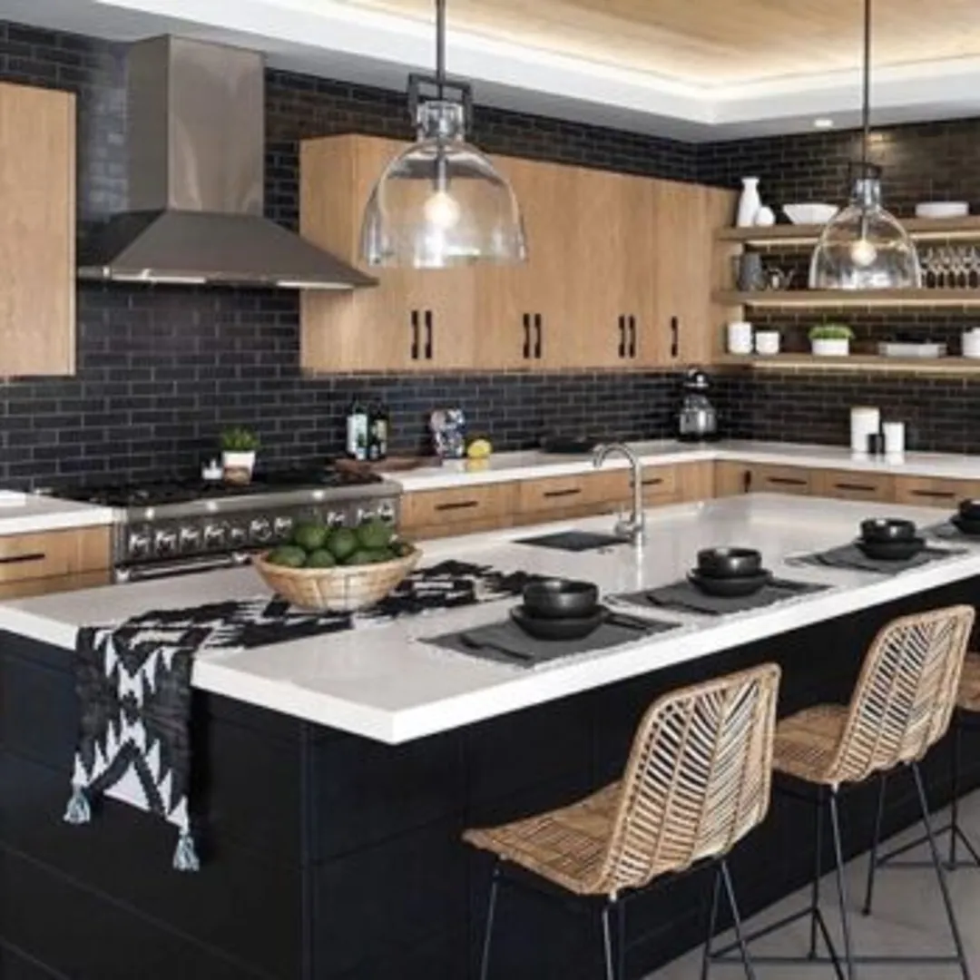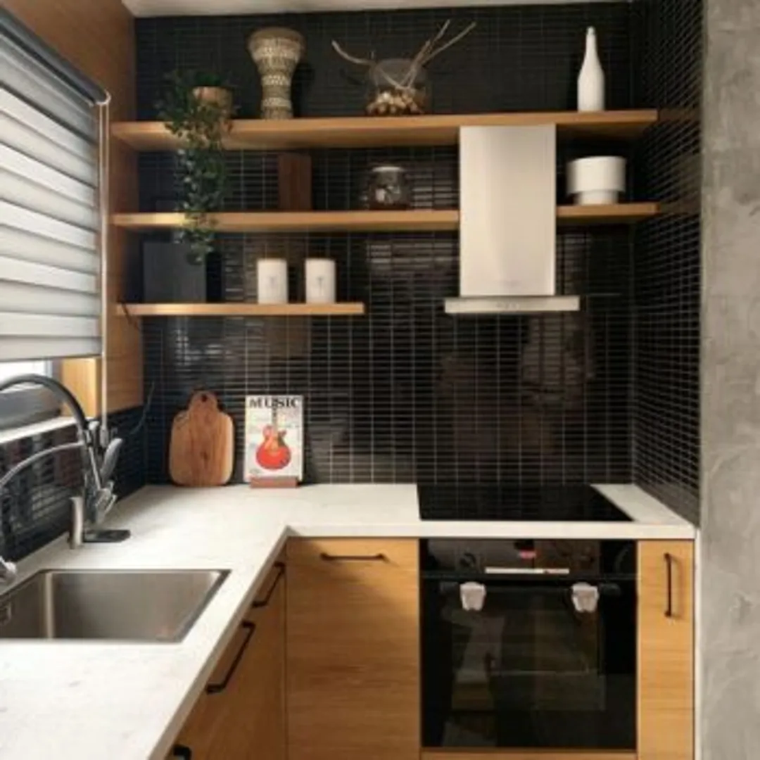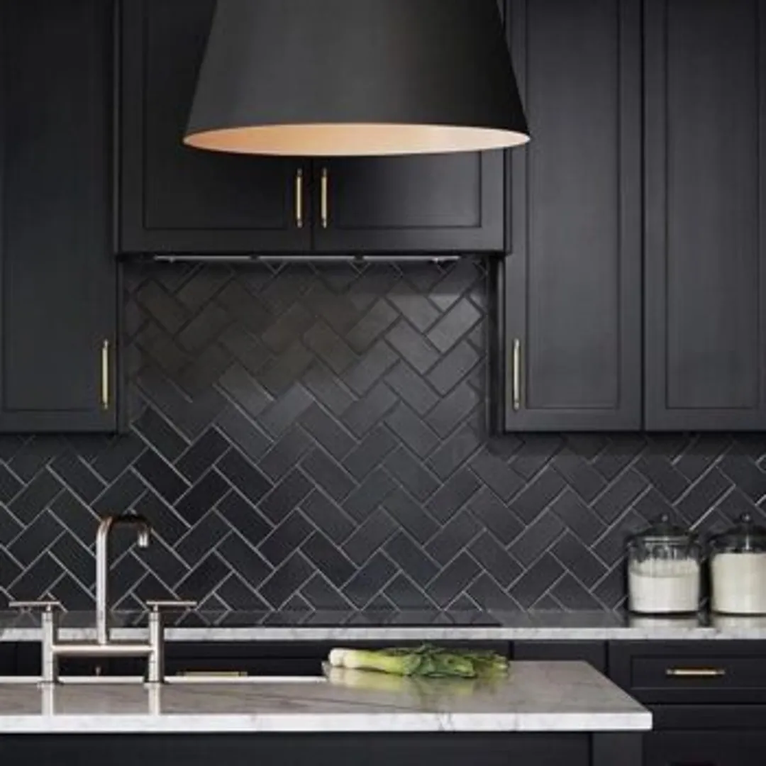Поскольку черный – нейтральный цвет, вы найдете его в различных материалах, он даст вам множество разнообразных идей. Это могут быть черные кварцевые столешницы, переходящие вверх, в черный фартук. Другой вариант — использовать металл, окрашенный в черный цвет. Черная стеклянная плитка элегантна своим сочетанием прозрачности и темного цвета.
