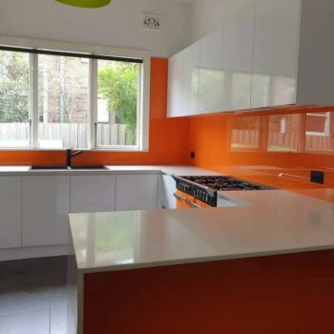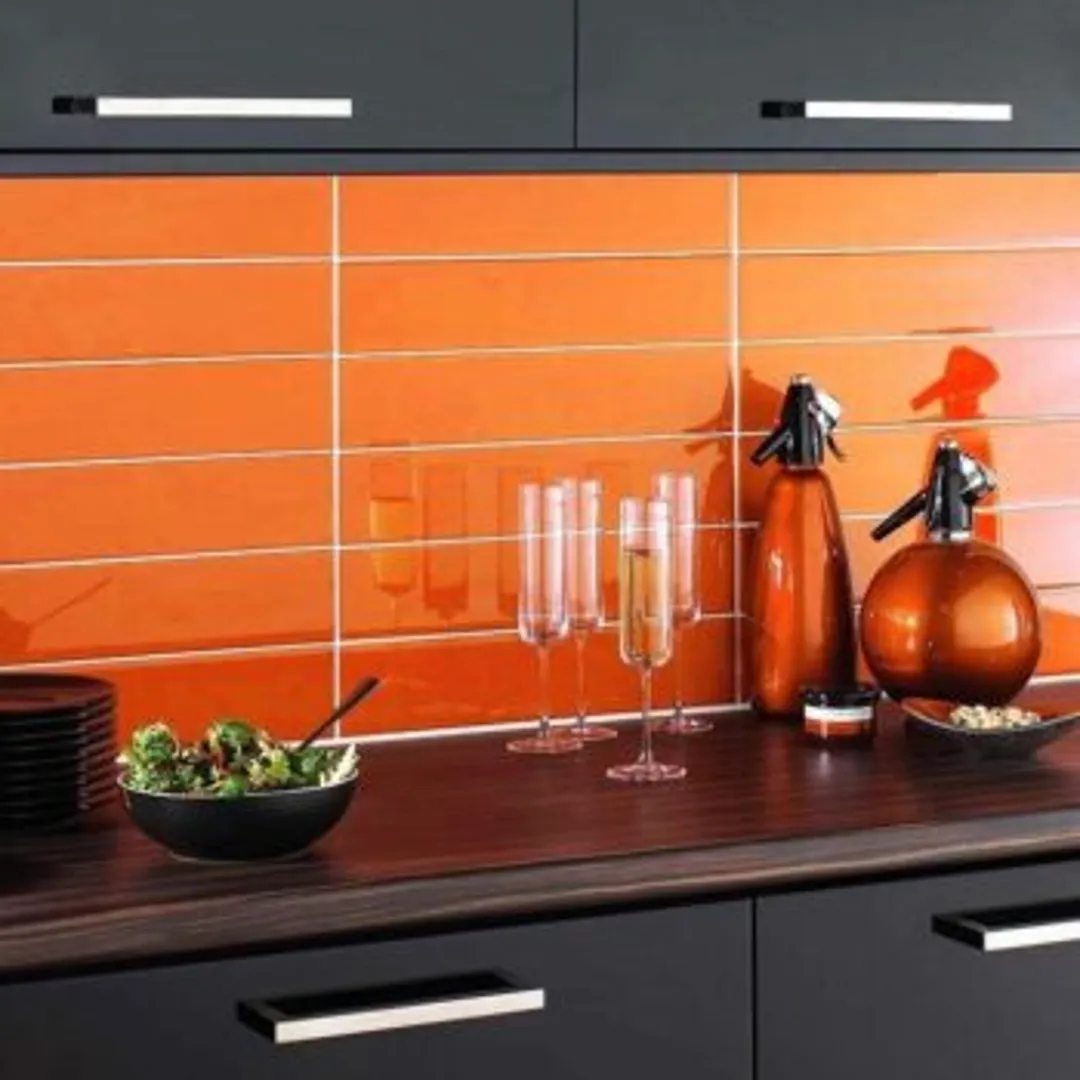 Насыщенно-оранжевый фартук добавит яркости вашей кухне. Он отлично подойдет, если у вас белые или черные кухонные шкафы и пол нейтрального цвета. Простота всего остального сделает оранжевый цвет ярким.