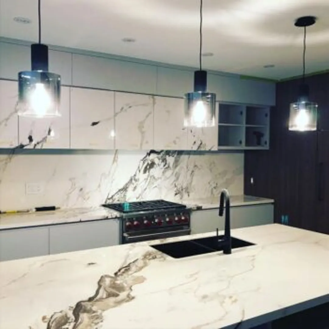Если у вас уже есть мраморная столешница, почему бы не продолжить образ в виде мраморного фартука? Он создаст непрерывный поток благородного камня по всей кухне. Также он хорошо сочетается с гранитными поверхностями столов.