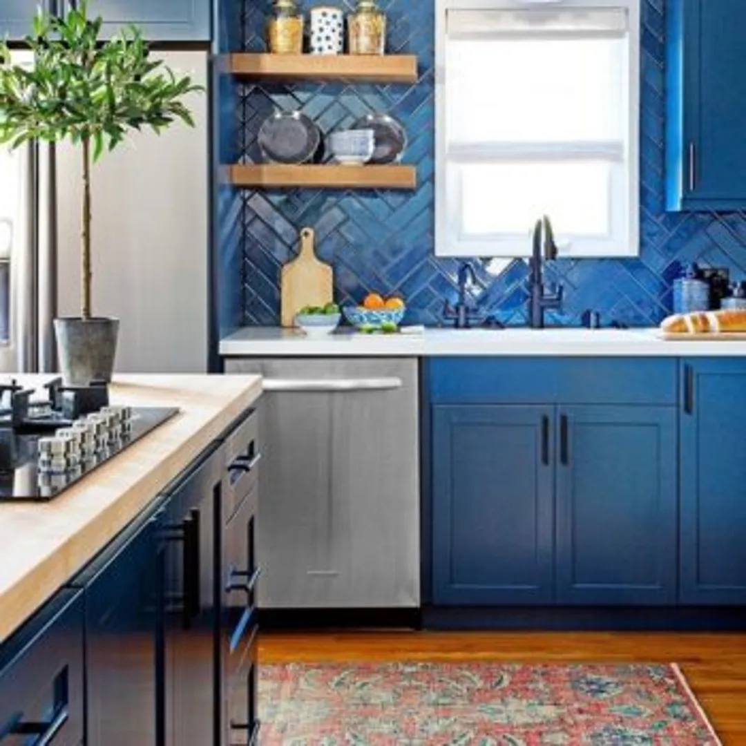 Когда приходит время добавить синего цвета к фартуку, выбирайте настенную плитку. Варианты синего представлены в самых различных оттенках, на ваш вкус. Вы также можете выбрать натуральный камень, с разными расцветками синего. Вам будет легче сочетать кухню с интерьером, если элементы из дерева приобретут оттенки коричневого в камне.
