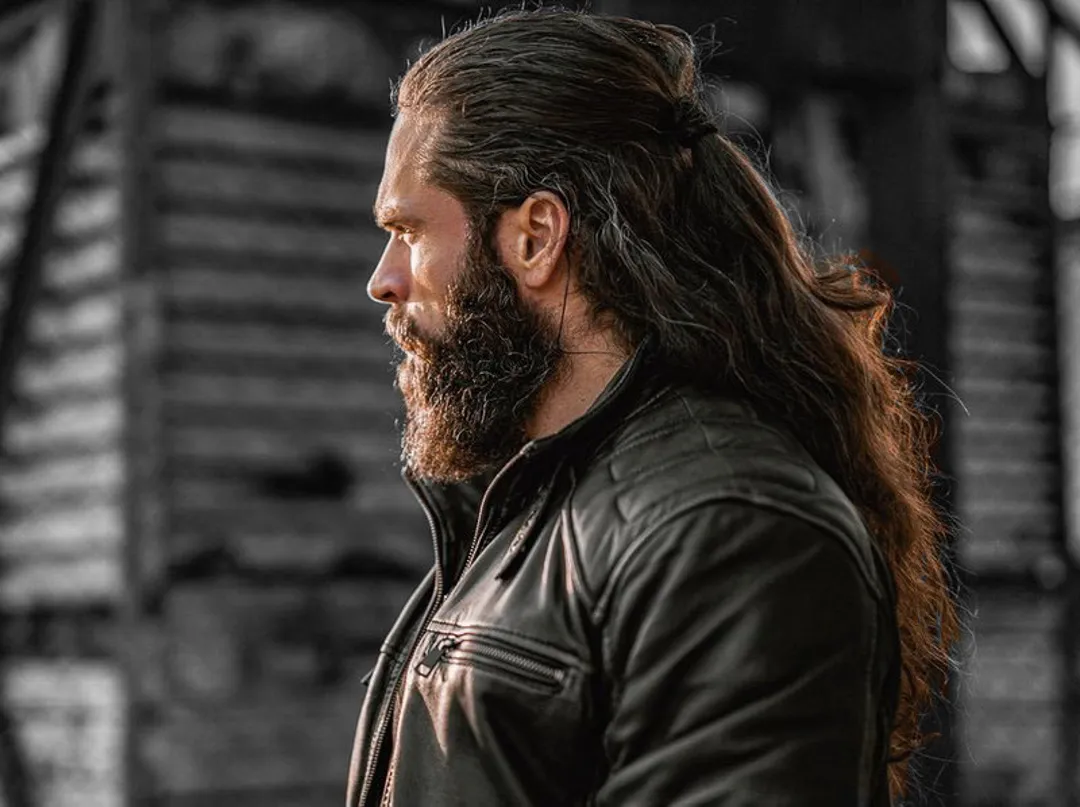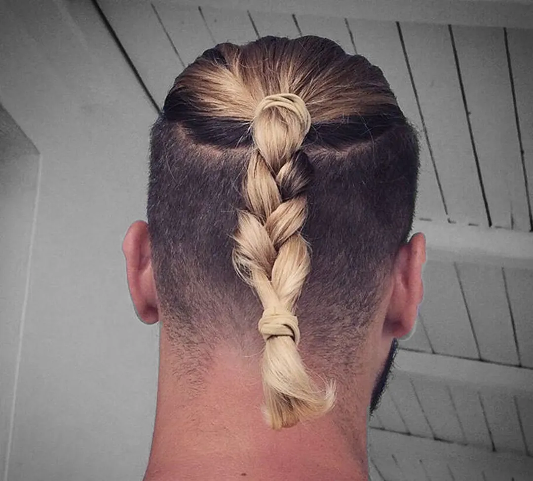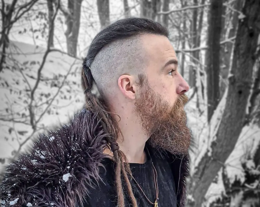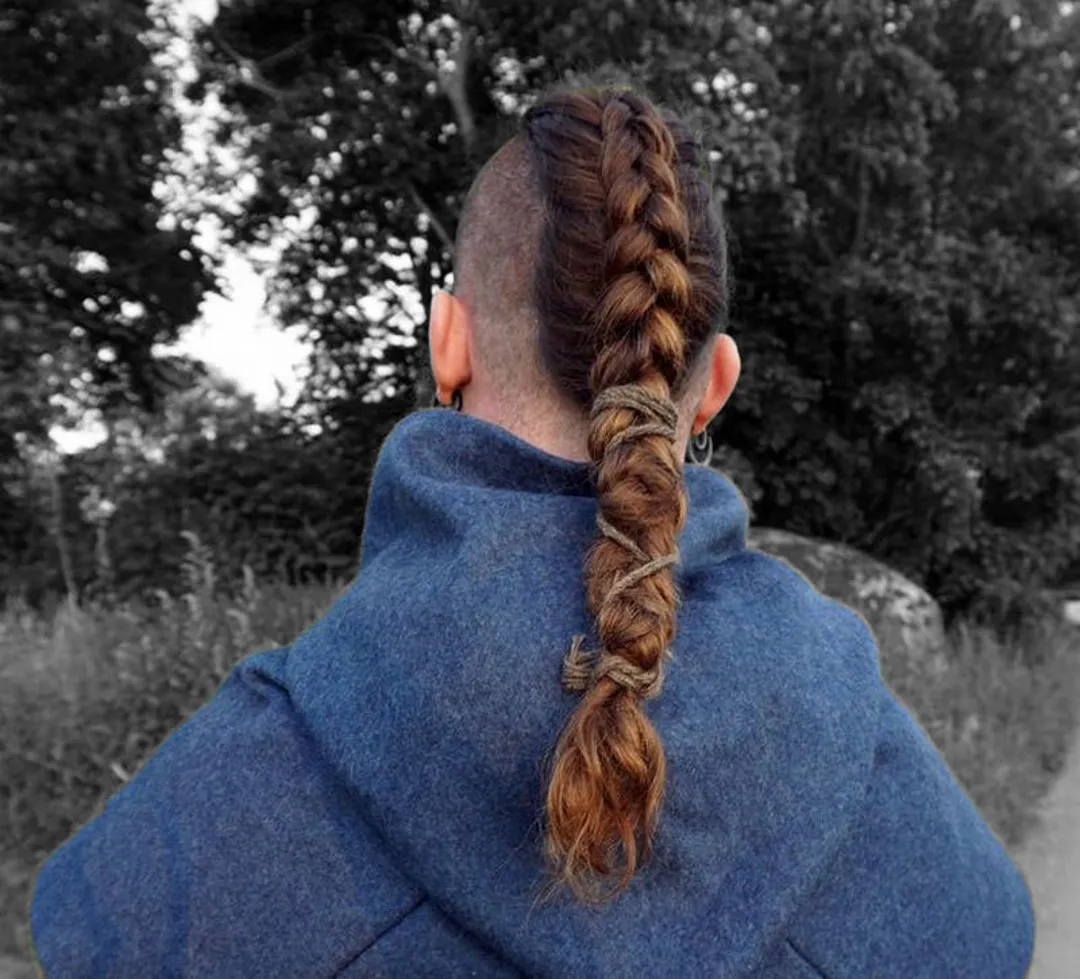 Чтобы выглядеть потрясающе, вам нужно чисто побрить боковые зоны, оставив длинную полосу волос, спускающуюся сверху к затылку. Чтобы закончить образ, заплетите длинные волосы в косу «рыбий хвост» и завяжите ее. Этот образ обычно сочетался с бородой.