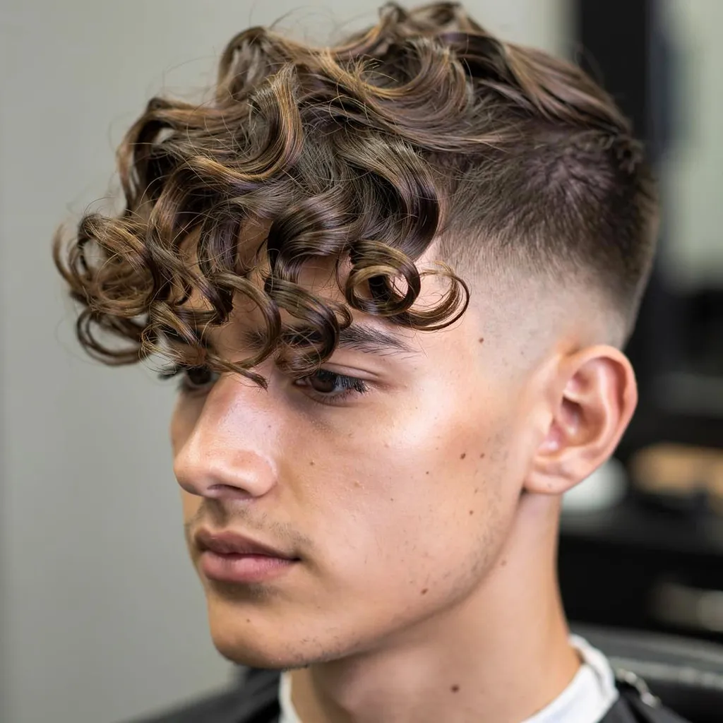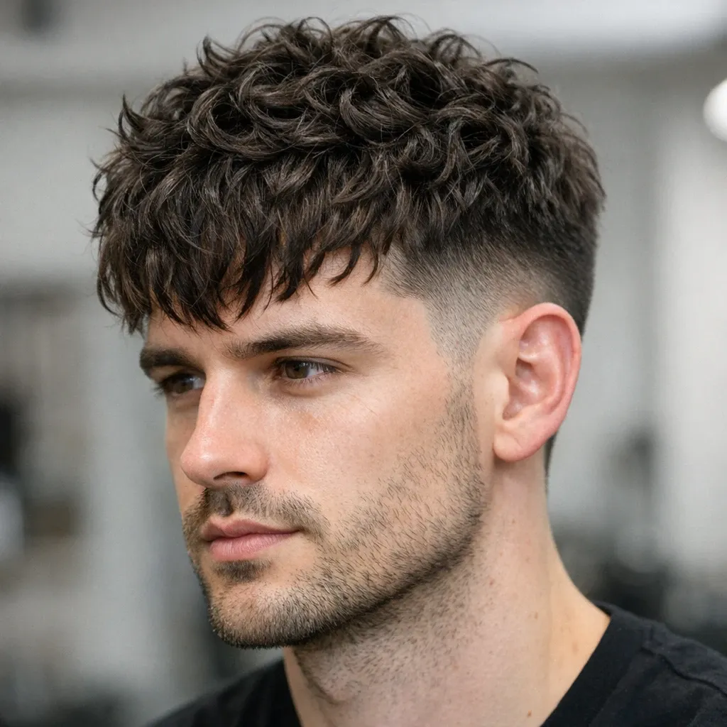 Главный акцент здесь — удлинённая кудрявая чёлка, которая падает на лоб или чуть набок. Бока могут быть как коротко стрижены (taper/fade), так и средней длины.