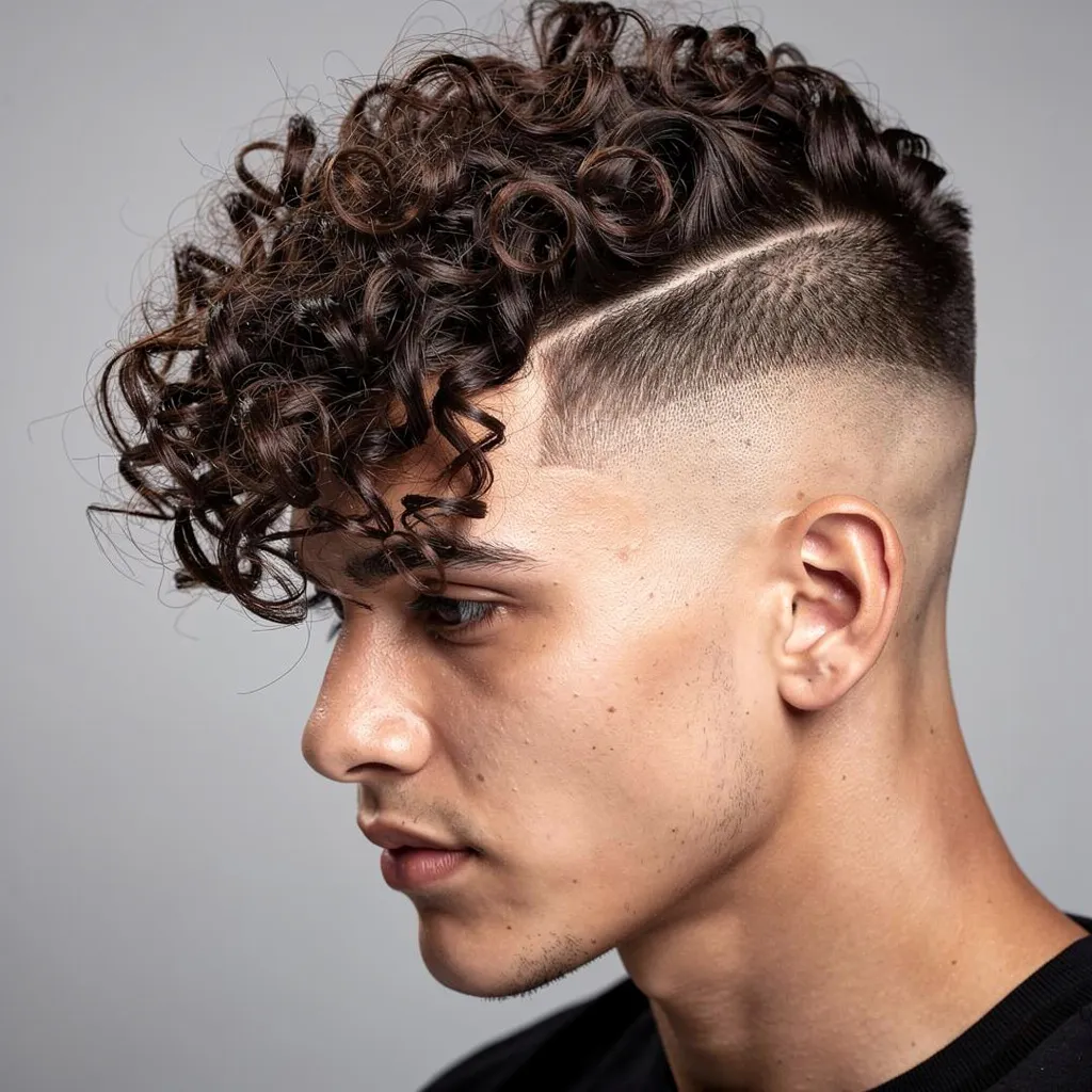 High fade — более смелая версия фейда: виски и затылок стригутся очень коротко или практически «в ноль», а кудри на макушке остаются заметно длиннее.