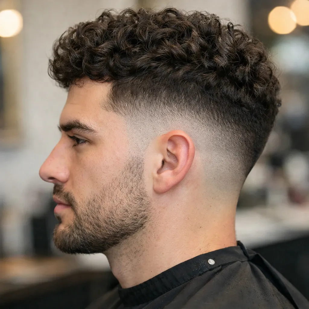 Taper fade — плавный переход длины от висков и шеи к более длинному верху. На кудрявых волосах это даёт чистый, «собранный» вид по контуру и живой объем сверху.