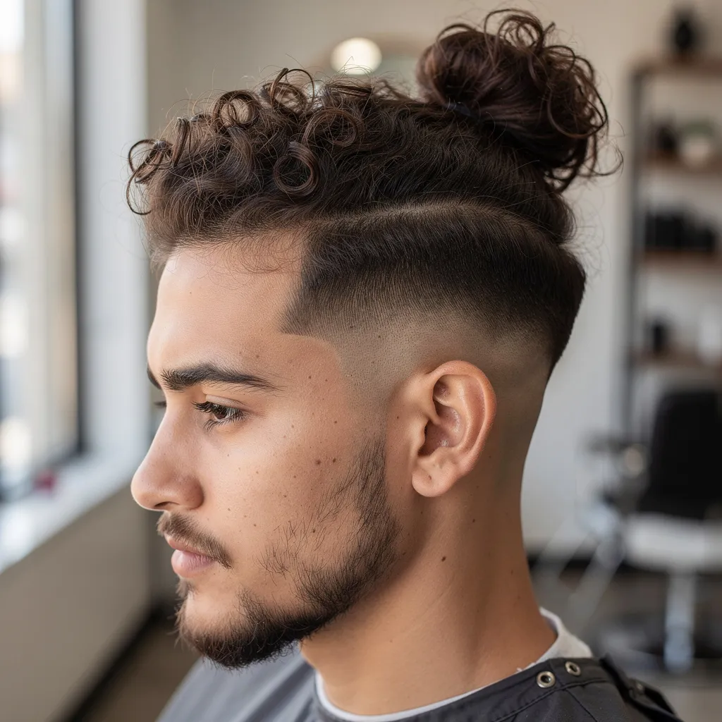 Здесь важна не только длина, но и стрижка: виски и затылок могут быть подстрижены короче (taper/fade/undercut), а верх и затылок — достаточно длинные, чтобы собрать волосы в пучок или хвост.