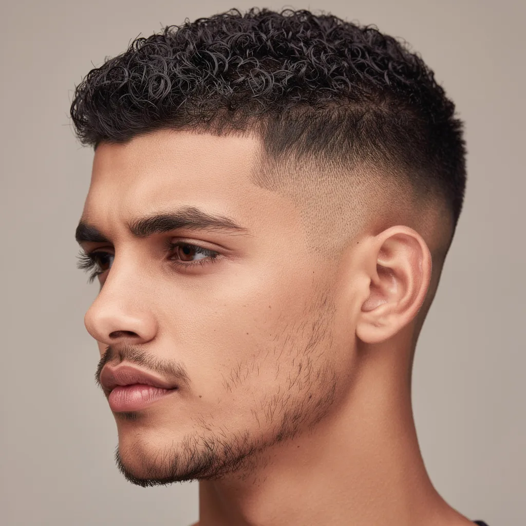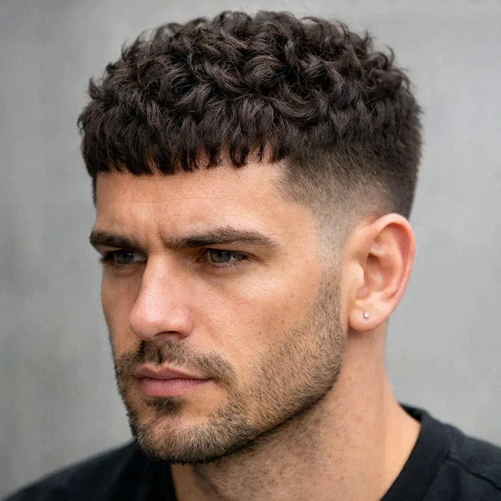 Классический кроп адаптирован под кудрявые волосы: короткие боковые зоны, чуть более удлинённый верх с выраженной текстурой. Чёлка может быть прямой или слегка асимметричной.