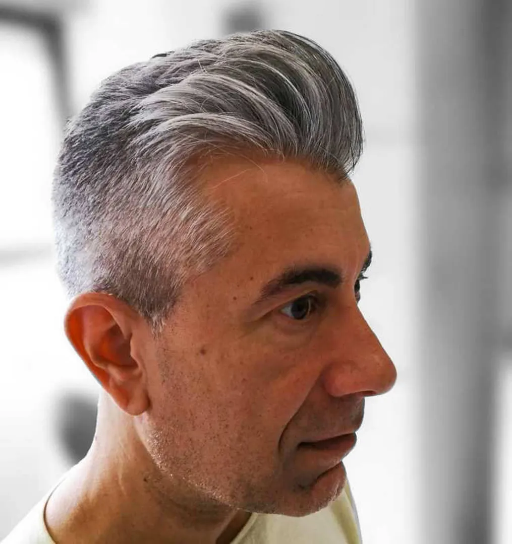 Небольшой помпадур или Квифф спереди добавляют текстурности и объема всему образу, что является важным аспектом мужской прически для седых волос.