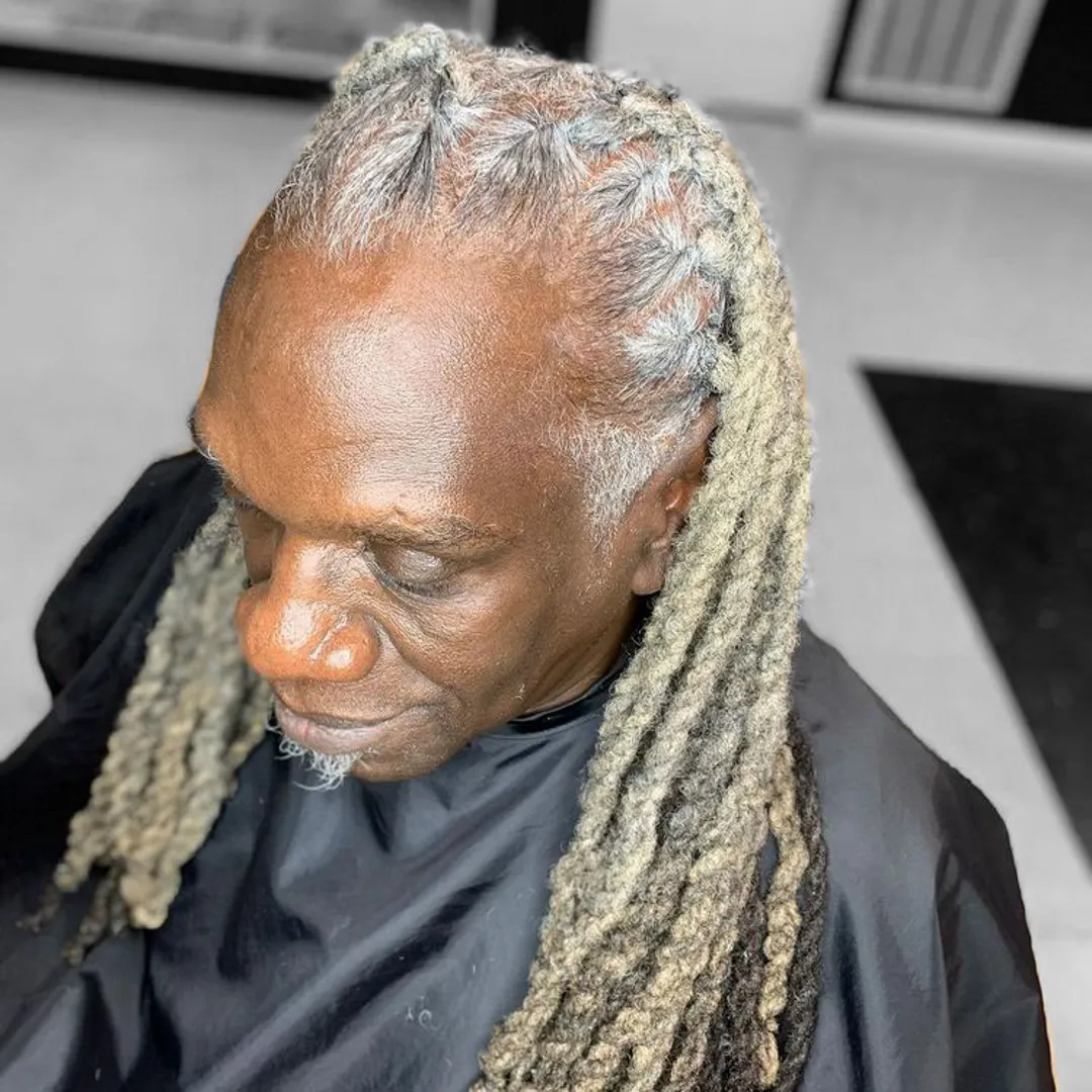 Эта прическа идеально подходит для мужчин, которые хотят плавно перейти от черных волос к седым, и не потерять при этом дреды. Дреды являются хорошим примером прически, неподвластной времени, и человек любого возраста может их носить.